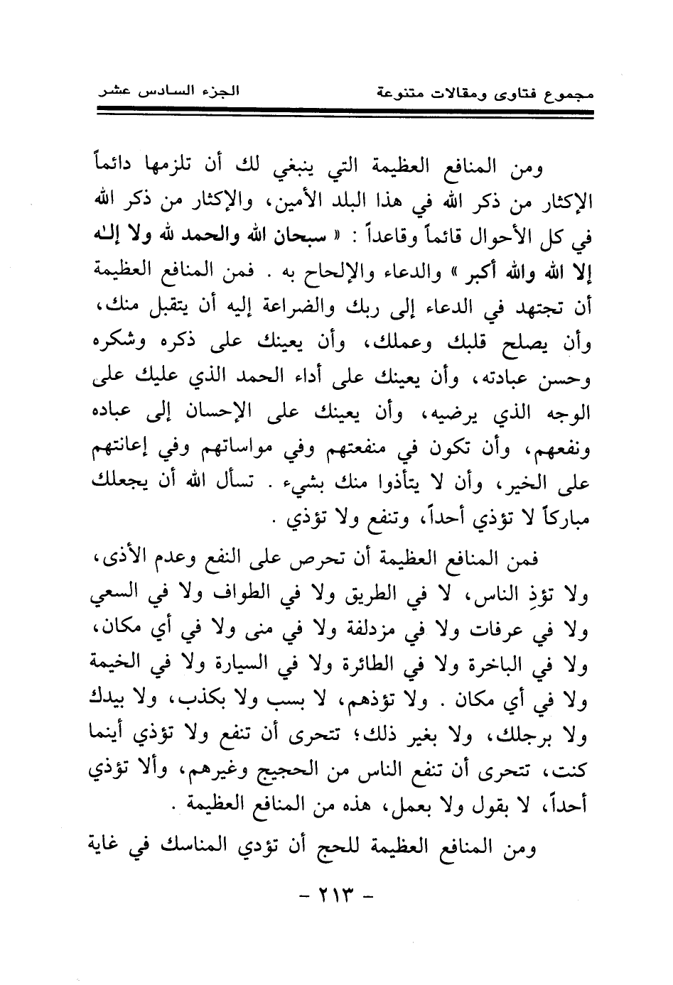 ومن المنافع العظيمة التي لا ينبغي لك أن تلزمها دائما الإكثار من ذكر الله في هذا البلد الأمين، والإكثار من ذكر الله في كل الأحوال قائما وقاعدا: " سبحان الله والحمد لله ولا إله إلا الله والله أكبر " والدعاء والإلحاح به. فمن المنافع العظيمة أن تجتهد في الدعاء إلى ربك والضراعة إليه أن يتقبل منك، وأن يصلح قلبك وعملك، وأن يعينك على ذكره وشكره وحسن عبادته، وأن يعينك على أداء الحمد الذي عليك على الوجه الذي يرضيه، وأن يعينك على الإحسان إلى عباده ونفعهم، وأن تكون في منفعتهم وفي مواساتهم وفي إعانتهم على الخير، وأن لا يتأذوا منك بشيء. تسأل الله أن يجعلك مباركا لا تؤذي أحدا، وتنفع ولا تؤذي.