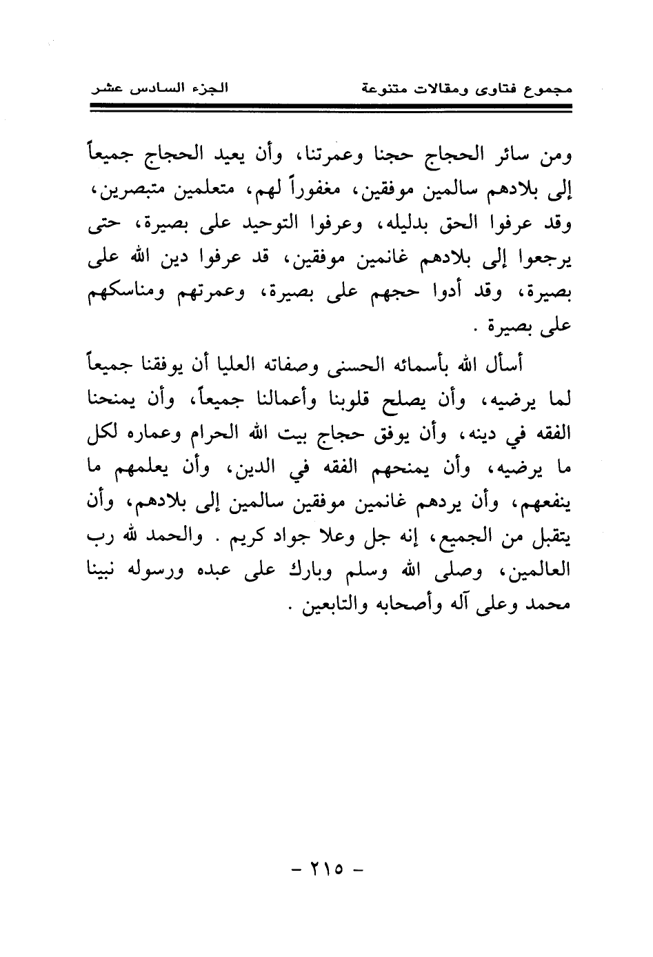أسأل الله بأسمائه الحسنى وصفاته العليا أن يوفقنا جميعا لما يرضيه وأن يصلح قلوبنا وأعمالنا جميعا، وأن يمنحنا الفقه في دينه، وأن يوفق حجاج بيت الله الحرام وعماره لكل ما يرضيه، وأن يمنحهم الفقه في الدين، وأن يعلمهم ما ينفعهم، وأن يردهم غانمين موفقين سالمين إلى بلادهم، وأن يتقبل من الجميع، إنه جل وعلا جواد كريم. والحمد لله رب العالمين، وصلى الله وسلم وبارك على عبده ورسوله نبينا محمد وعلى آله وأصحابه والتابعين.