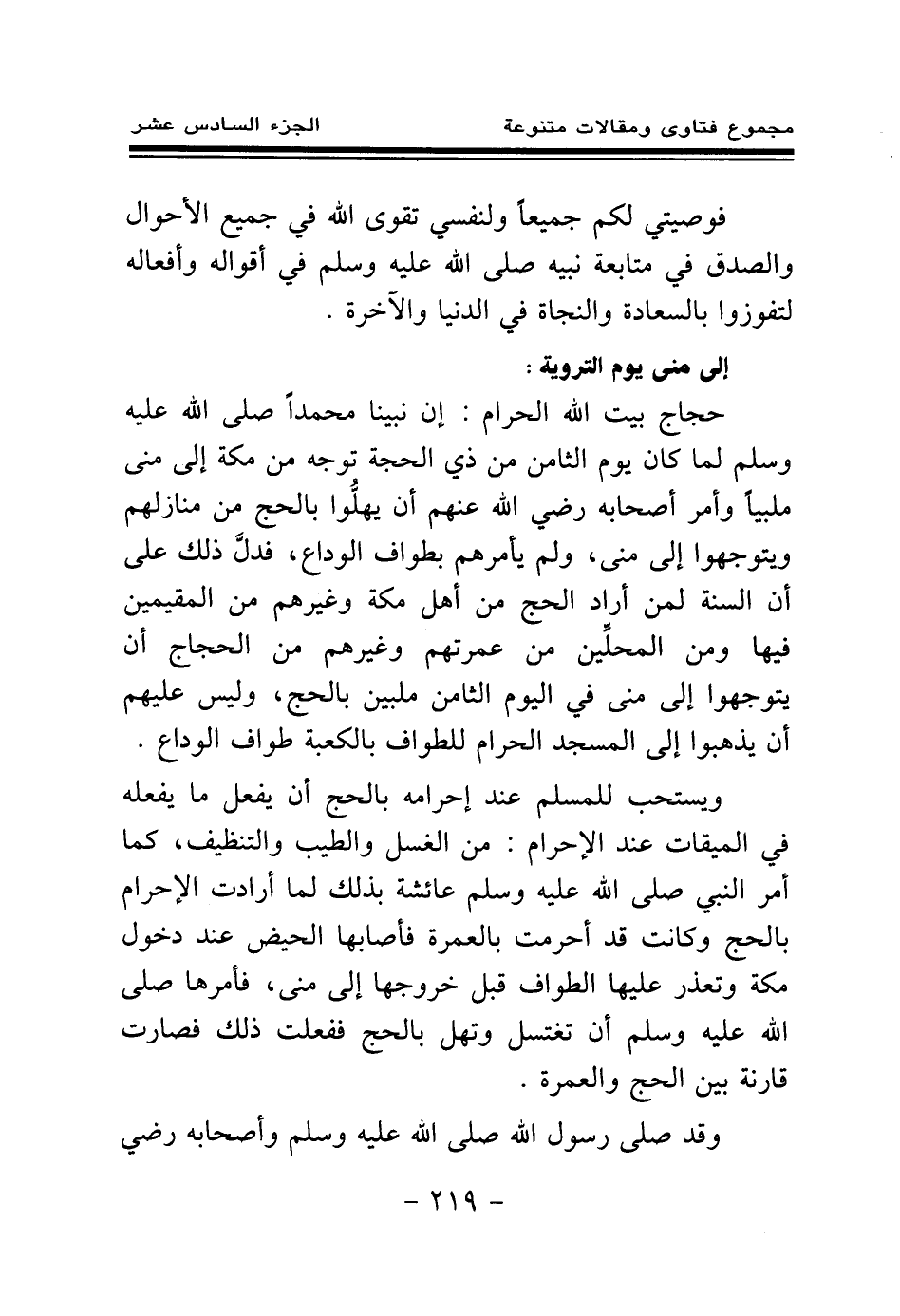 حجاج بيت الله الحرام: إن نبينا محمدا صلى الله عليه وسلم لما كان يوم الثامن من ذي الحجة توجه من مكة إلى منى ملبيا وأمر أصحابه رضي الله عنهم أن يهلوا بالحج من منازلهم ويتوجهوا إلى منى، ولم يأمرهم بطواف الوداع، فدل ذلك على أن السنة لمن أراد الحج من أهل مكة وغيرهم من المقيمين فيها ومن المحلين من عمرتهم وغيرهم من الحجاج أن يتوجهوا إلى منى في اليوم الثامن ملبين بالحج، وليس عليهم أن يذهبوا إلى المسجد الحرام للطواف بالكعبة طواف الوداع.