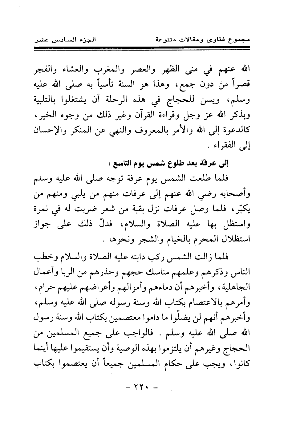 الله عنهم في منى الظهر والعصر والمغرب والعشاء والفجر قصرا من دون جمع، وهذا هو السنة تأسيا به صلى الله عليه وسلم، ويسن للحجاج في هذه الرحلة أن يشتغلوا بالتلبية وبذكر الله عز وجل وقراءة القرآن وغير ذلك من وجوه الخير، كالدعوة إلى الله والأمر بالمعروف والنهي عن المنكر والإحسان إلى الفقراء.