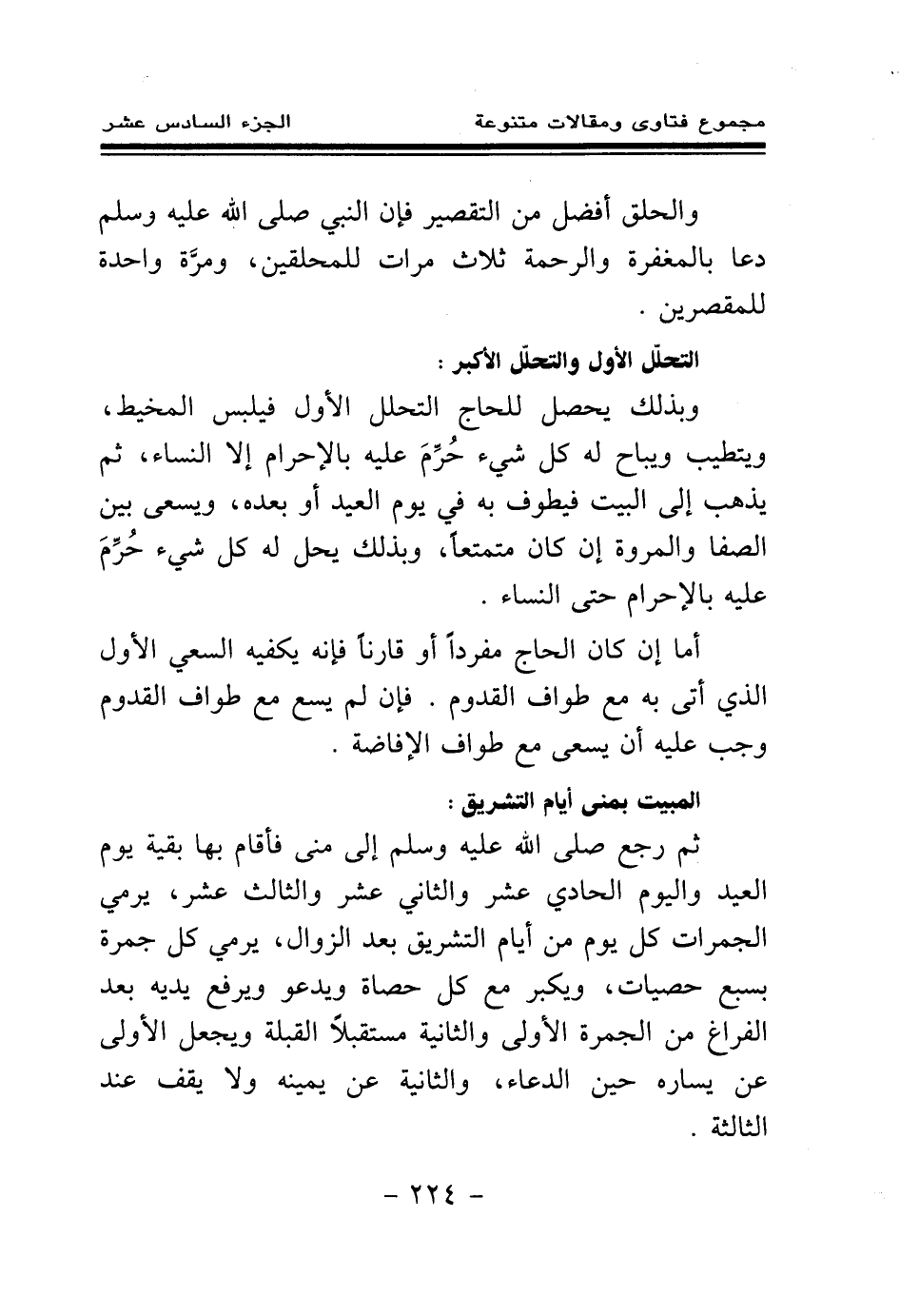 وبذلك يحصل للحاج التحلل الأول فيلبس المخيط، ويتطيب ويباح له كل شيء حرم عليه بالإحرام إلا النساء، ثم يذهب إلى البيت فيطوف به في يوم العيد أو بعده، ويسعى بين الصفا والمروة إن كان متمتعا، وبذلك يحل له كل شيء حرم عليه بالإحرام حتى النساء.