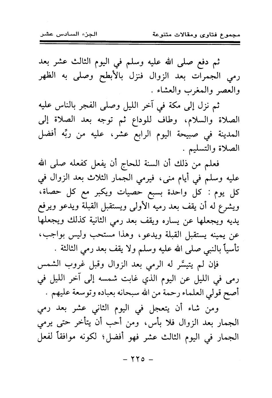 فعلم من ذلك أن السنة للحاج أن يفعل كفعله صلى الله عليه وسلم في أيام منى، فيرمي الجمار الثلاث بعد الزوال في كل يوم: كل واحدة بسبع حصيات ويكبر مع كل حصاة، ويشرع له أن يقف بعد رميه الأولى ويستقبل القبلة ويدعو ويرفع يديه ويجعلها عن يساره ويقف بعد رمي الثانية كذلك ويجعلها عن يمينه يستقبل القبلة ويدعو، وهذا مستحب وليس بواجب، تأسيا بالنبي صلى الله عليه وسلم ولا يقف بعد رمي الثالثة.