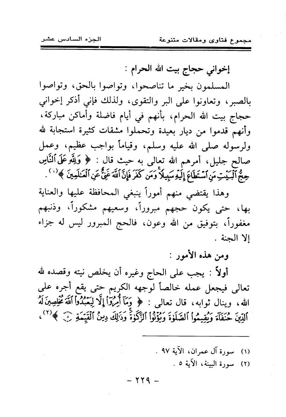 المسلمون بخير ما تناصحوا، وتواصوا بالحق، وتواصوا بالصبر، وتعاونوا على البر والتقوى، ولذلك فإني أذكر إخواني حجاج بيت الله الحرام، بأنهم في أيام فاضلة وأماكن مباركة، وأنهم قدموا من ديار بعيدة وتحملوا مشقات كثيرة استجابة لله ولرسوله صلى الله عليه وسلم، وقياما بواجب عظيم، وعمل صالح جليل، أمرهم الله تعالى به حيث قال: {وَلِلَّهِ عَلَى النَّاسِ حِجُّ الْبَيْتِ مَنِ اسْتَطَاعَ إِلَيْهِ سَبِيلًا وَمَنْ كَفَرَ فَإِنَّ اللَّهَ غَنِيٌّ عَنِ الْعَالَمِينَ} (¬1)