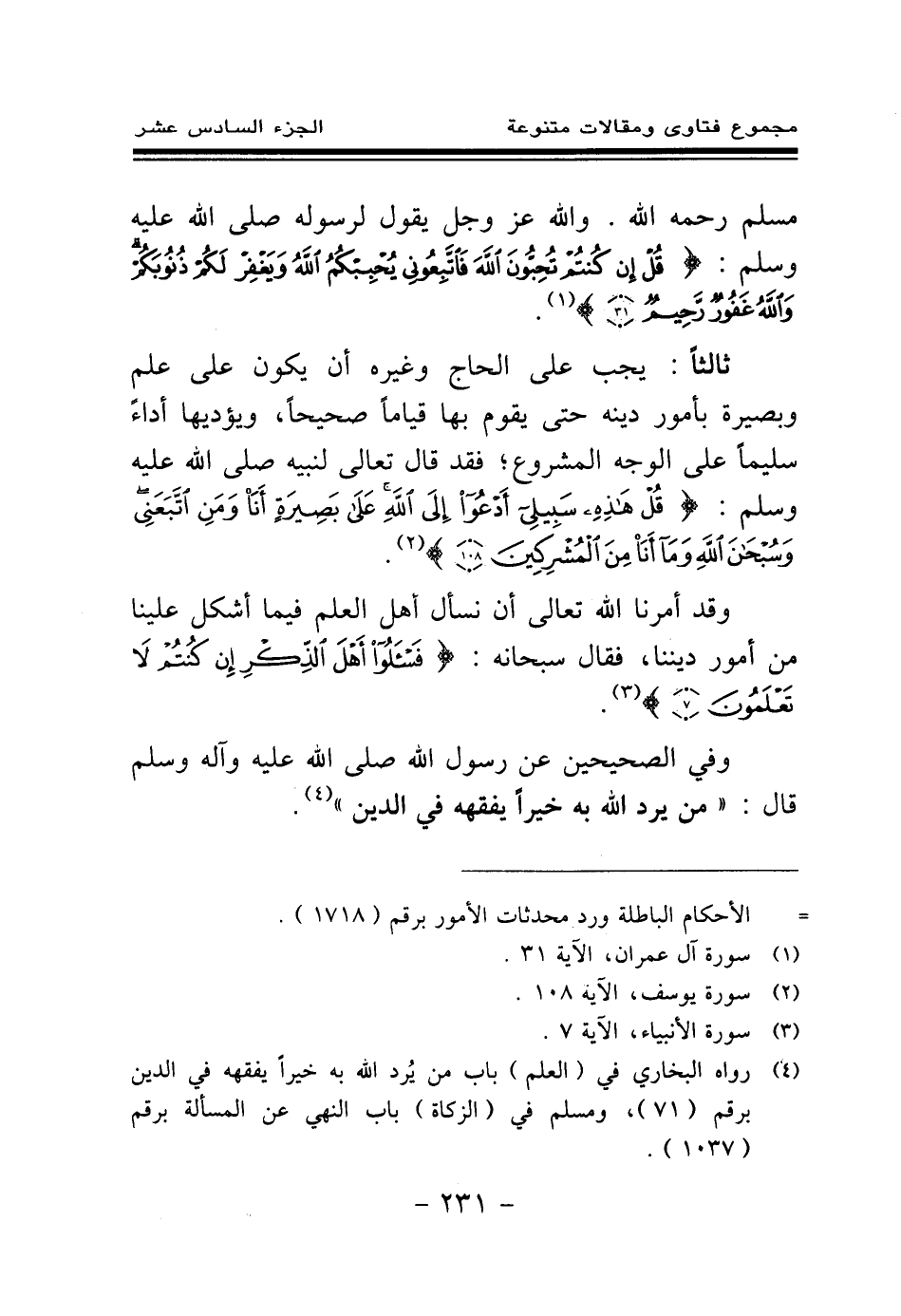 ثالثا: يجب على الحاج وغيره أن يكون على علم وبصيرة بأمور دينه حتى يقوم قياما صحيحا، ويؤديها أداء سليما على الوجه المشروع؛ فقد قال تعالى لنبيه صلى الله عليه وسلم: {قُلْ هَذِهِ سَبِيلِي أَدْعُو إِلَى اللَّهِ عَلَى بَصِيرَةٍ أَنَا وَمَنِ اتَّبَعَنِي وَسُبْحَانَ اللَّهِ وَمَا أَنَا مِنَ الْمُشْرِكِينَ} (¬2)