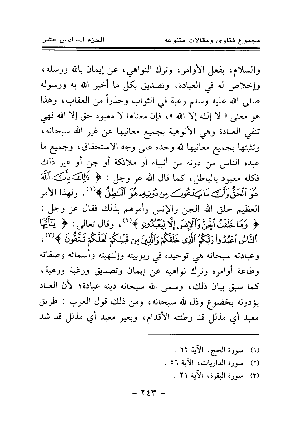 والسلام، بفعل الأوامر، وترك النواهي، عن إيمان بالله ورسله، وإخلاص له في العبادة، وتصديق بكل ما أخبر الله به ورسوله صلى الله عليه وسلم رغبة في الثواب وحذرا من العقاب، وهذا هو معنى " لا إله إلا الله "، فإن معناها: لا معبود حق إلا الله، فهي تنفي العبادة - وهي الألوهية بجميع معانيها - عن غير الله سبحانه، وتثبتها بجميع معانيها لله وحده على وجه الاستحقاق، وجميع ما عبده الناس من دونه من أنبياء أو ملائكة أو جن أو غير ذلك فكله معبود بالباطل، كما قال الله عز وجل: {ذَلِكَ بِأَنَّ اللَّهَ هُوَ الْحَقُّ وَأَنَّ مَا يَدْعُونَ مِنْ دُونِهِ هُوَ الْبَاطِلُ} (¬1) ولهذا الأمر العظيم خلق الله الجن والإنس وأمرهم بذلك فقال عز وجل: {وَمَا خَلَقْتُ الْجِنَّ وَالْإِنْسَ إِلَّا لِيَعْبُدُونِ} (¬2) وقال تعالى: {يَا أَيُّهَا النَّاسُ اعْبُدُوا رَبَّكُمُ الَّذِي خَلَقَكُمْ وَالَّذِينَ مِنْ قَبْلِكُمْ لَعَلَّكُمْ تَتَّقُونَ} (¬3) وعبادته سبحانه هي توحيده في ربوبيته وإلهيته وأسمائه وصفاته وطاعة أوامره وترك نواهيه عن إيمان وتصديق ورغبة ورهبة، كما سبق بيان ذلك، وسمى الله سبحانه دينه عبادة؛ لأن العباد يؤدونه بخضوع وذل لله سبحانه، ومن ذلك قول العرب: طريق معبد أي مذلل قد وطئته الأقدام، وبعير معبد أي مذلل قد شد