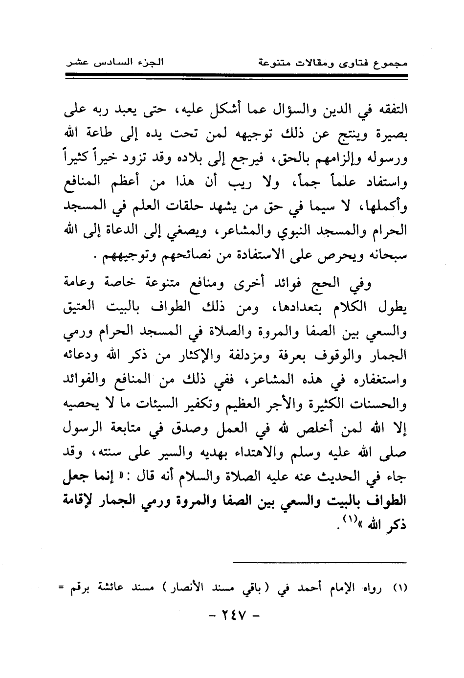 وفي الحج فوائد أخرى ومنافع متنوعة خاصة وعامة يطول الكلام بتعدادها، ومن ذلك الطواف بالبيت العتيق والسعي بين الصفا والمروة والصلاة في المسجد الحرام ورمي الجمار والوقوف بعرفة ومزدلفة والإكثار من ذكر الله ودعائه واستغفاره في هذه المشاعر، ففي ذلك من المنافع والفوائد والحسنات الكثيرة والأجر العظيم وتكفير السيئات ما لا يحصيه إلا الله لمن أخلص لله في العمل وصدق في متابعة الرسول صلى الله عليه وسلم والاهتداء بهديه والسير على سنته، وقد جاء في الحديث عنه عليه الصلاة والسلام أنه قال: «إنما جعل الطواف بالبيت والسعي بين الصفا والمروة ورمي الجمار لإقامة ذكر الله (¬1) » .