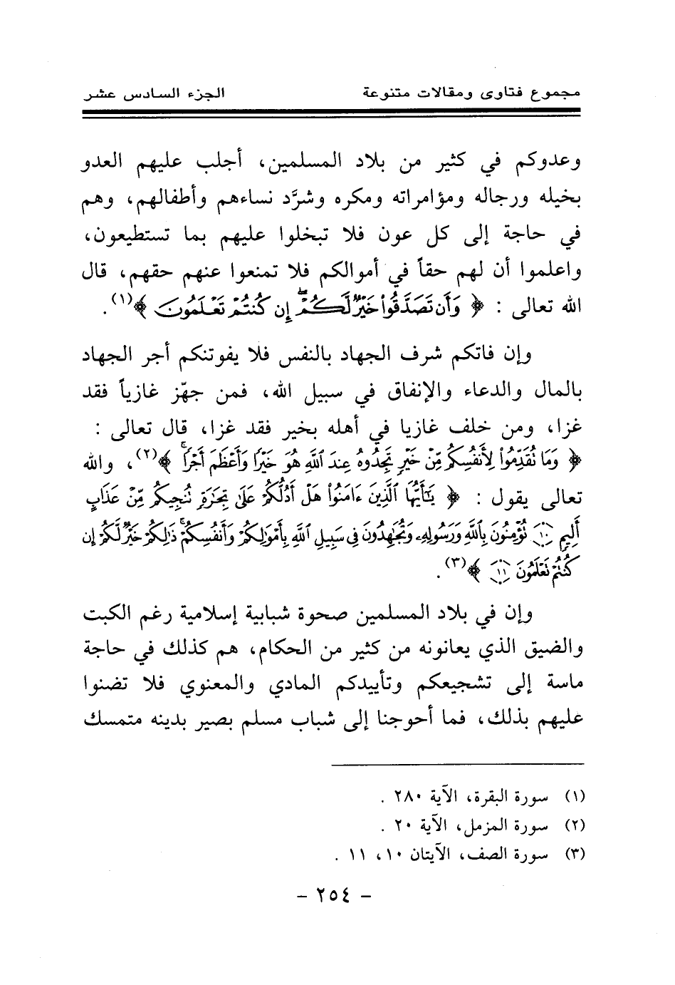 وإن فاتكم شرف الجهاد بالنفس فلا يفوتنكم أجر الجهاد بالمال والدعاء والإنفاق في سبيل الله، فمن جهز غازيا فقد غزا، ومن خلف غازيا في أهله بخير فقد غزا، قال تعالى: {وَمَا تُقَدِّمُوا لِأَنْفُسِكُمْ مِنْ خَيْرٍ تَجِدُوهُ عِنْدَ اللَّهِ هُوَ خَيْرًا وَأَعْظَمَ أَجْرًا} (¬2) والله تعالى يقول: {يَا أَيُّهَا الَّذِينَ آمَنُوا هَلْ أَدُلُّكُمْ عَلَى تِجَارَةٍ تُنْجِيكُمْ مِنْ عَذَابٍ أَلِيمٍ} (¬3) {تُؤْمِنُونَ بِاللَّهِ وَرَسُولِهِ وَتُجَاهِدُونَ فِي سَبِيلِ اللَّهِ بِأَمْوَالِكُمْ وَأَنْفُسِكُمْ ذَلِكُمْ خَيْرٌ لَكُمْ إِنْ كُنْتُمْ تَعْلَمُونَ} (¬4)