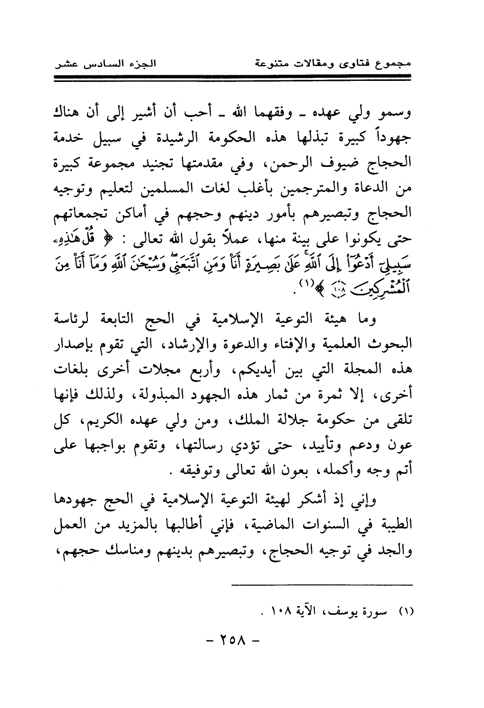 وسمو ولي عهده - وفقهما الله - أحب أن أشير إلى أن هناك جهودا كبيرة تبذلها هذه الحكومة الرشيدة في سبيل خدمة الحجاج ضيوف الرحمن، وفي مقدمتها تجنيد مجموعة كبيرة من الدعاة والمترجمين بأغلب لغات المسلمين لتعليم وتوجيه الحجاج وتبصيرهم بأمور دينهم وحجهم في أماكن تجمعاتهم حتى يكونوا على بينة منها، عملا بقول الله تعالى: {قُلْ هَذِهِ سَبِيلِي أَدْعُو إِلَى اللَّهِ عَلَى بَصِيرَةٍ أَنَا وَمَنِ اتَّبَعَنِي وَسُبْحَانَ اللَّهِ وَمَا أَنَا مِنَ الْمُشْرِكِينَ} (¬1)