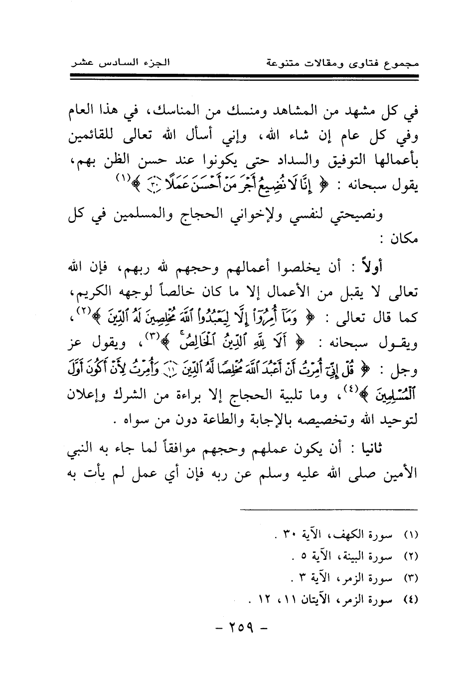 في كل مشهد من المشاهد ومنسك من المناسك، في هذا العام وفي كل عام إن شاء الله، وإني أسأل الله تعالى للقائمين بأعمالها التوفيق والسداد حتى يكونوا عند حسن الظن بهم، يقول سبحانه: {إِنَّا لَا نُضِيعُ أَجْرَ مَنْ أَحْسَنَ عَمَلًا} (¬1)