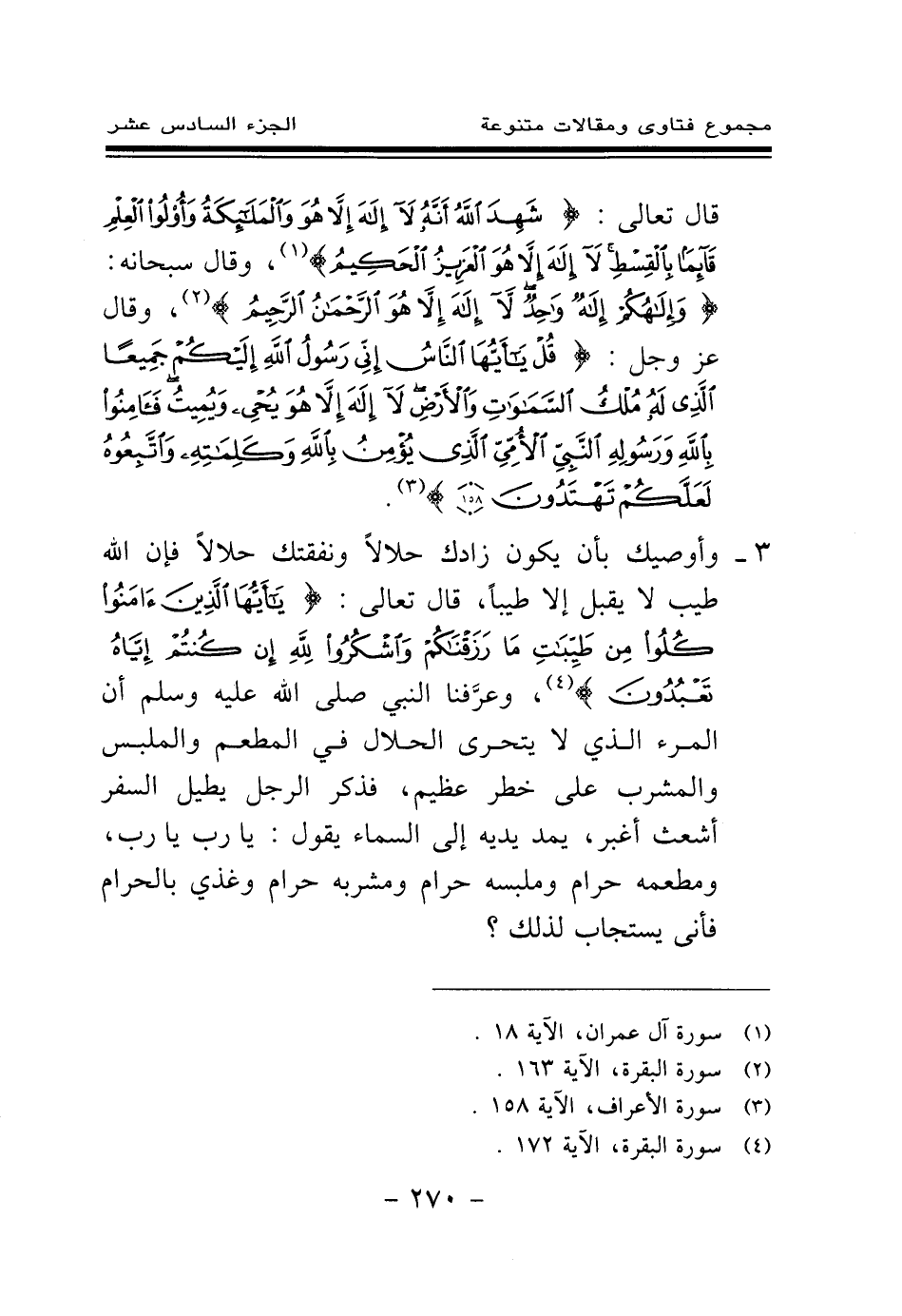 3 - وأوصيك بأن يكون زادك حلالا ونفقتك حلالا فإن الله طيب لا يقبل إلا طيبا، قال تعالى: {يَا أَيُّهَا الَّذِينَ آمَنُوا كُلُوا مِنْ طَيِّبَاتِ مَا رَزَقْنَاكُمْ وَاشْكُرُوا لِلَّهِ إِنْ كُنْتُمْ إِيَّاهُ تَعْبُدُونَ} (¬4) وعرفنا النبي - صلى الله عليه وسلم - أن المرء الذي لا يتحرى الحلال في المطعم والملبس والمشرب على خطر عظيم، فذكر الرجل يطيل السفر أشعث أغبر، يمد يديه إلى السماء يقول: يا رب يا رب، ومطعمه حرام وملبسه حرام ومشربه حرام وغذي بالحرام فأنى يستجاب لذلك؟
