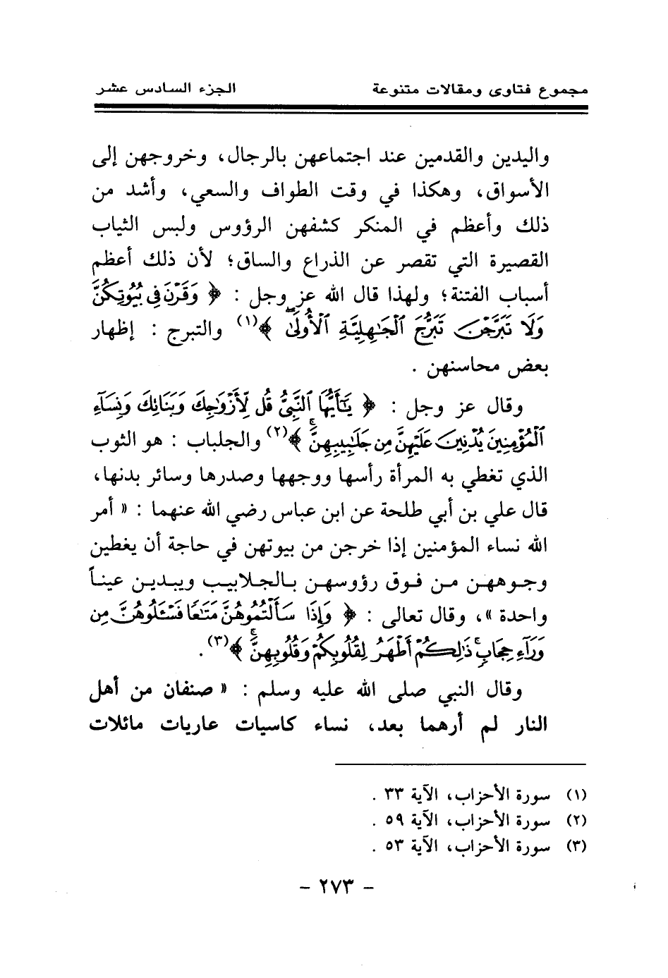 واليدين والقدمين عند اجتماعهن بالرجال، وخروجهن إلى الأسواق، وهكذا في وقت الطواف والسعي، وأشد من ذلك وأعظم في المنكر كشفهن الرءوس ولبس الثياب القصيرة التي تقصر عن الذراع والساق؛ لأن ذلك أعظم أسباب الفتن؛ ولهذا قال الله عز وجل: {وَقَرْنَ فِي بُيُوتِكُنَّ وَلَا تَبَرَّجْنَ تَبَرُّجَ الْجَاهِلِيَّةِ الْأُولَى} (¬1) والتبرج: إظهار بعض محاسنهن.