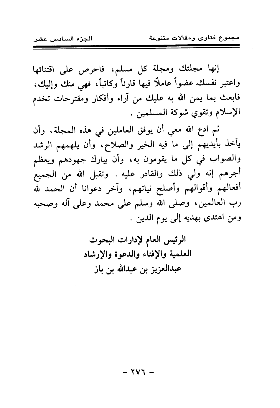ثم ادع الله معي أن يوفق العاملين في هذه المجلة، وأن يأخذ بأيديهم إلى ما فيه الخير والصلاح، وأن يلهمهم الرشد والصواب في كل ما يقومون به، وأن يبارك جهودهم ويعظم أجرهم إنه ولي ذلك والقادر عليه. وتقبل الله من الجميع أفعالهم وأقوالهم وأصلح نياتهم، وآخر دعوانا أن الحمد لله رب العالمين، وصلى الله وسلم على محمد وعلى آله وصحبه ومن اهتدى بهديه إلى يوم الدين.