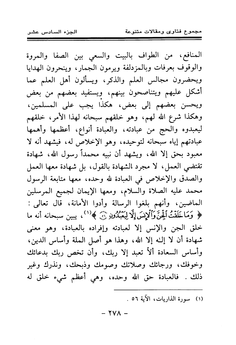 المنافع، من الطواف بالبيت والسعي بين الصفا والمروة والوقوف بعرفات وبالمزدلفة ويرمون الجمار، وينحرون الهدايا ويحضرون مجالس العلم والذكر، ويسألون أهل العلم عما أشكل عليهم ويتناصحون بينهم، ويستفيد بعضهم من بعض ويحسن بعضهم إلى بعض، هكذا يجب على المسلمين، وهكذا شرع الله لهم، وهو خلقهم سبحانه لهذا الأمر، خلقهم ليعبدوه والحج من عبادته، والعبادة أنواع، أعظمها وأهمها عبادتهم إياه سبحانه لتوحيده، وهو الإخلاص له، فيشهد أنه لا معبود بحق إلا الله، ويشهد أن نبيه محمدا رسول الله، شهادة تقتضي العمل، لا مجرد الشهادة بالقول، بل شهادة معها العمل والصدق والإخلاص في العبادة لله وحده، معها متابعة الرسول محمد - عليه الصلاة والسلام -، ومعها الإيمان لجميع المرسلين الماضين، وأنهم بلغوا الرسالة وأدوا الأمانة، قال تعالى: {وَمَا خَلَقْتُ الْجِنَّ وَالْإِنْسَ إِلَّا لِيَعْبُدُونِ} (¬1) يبين سبحانه أنه ما خلق الجن والإنس إلا لعبادته وإفراده بالعبادة، وهو معنى شهادة أن لا إله إلا الله، وهذا هو أصل الملة وأساس الدين، وأساس السعادة ألا تعبد إلا ربك، وأن تخص ربك بدعائك وخوفك، ورجائك وصلاتك وصومك وذبحك، ونذرك وغير ذلك. فالعبادة حق الله وحده، وهي أعظم شيء خلق له