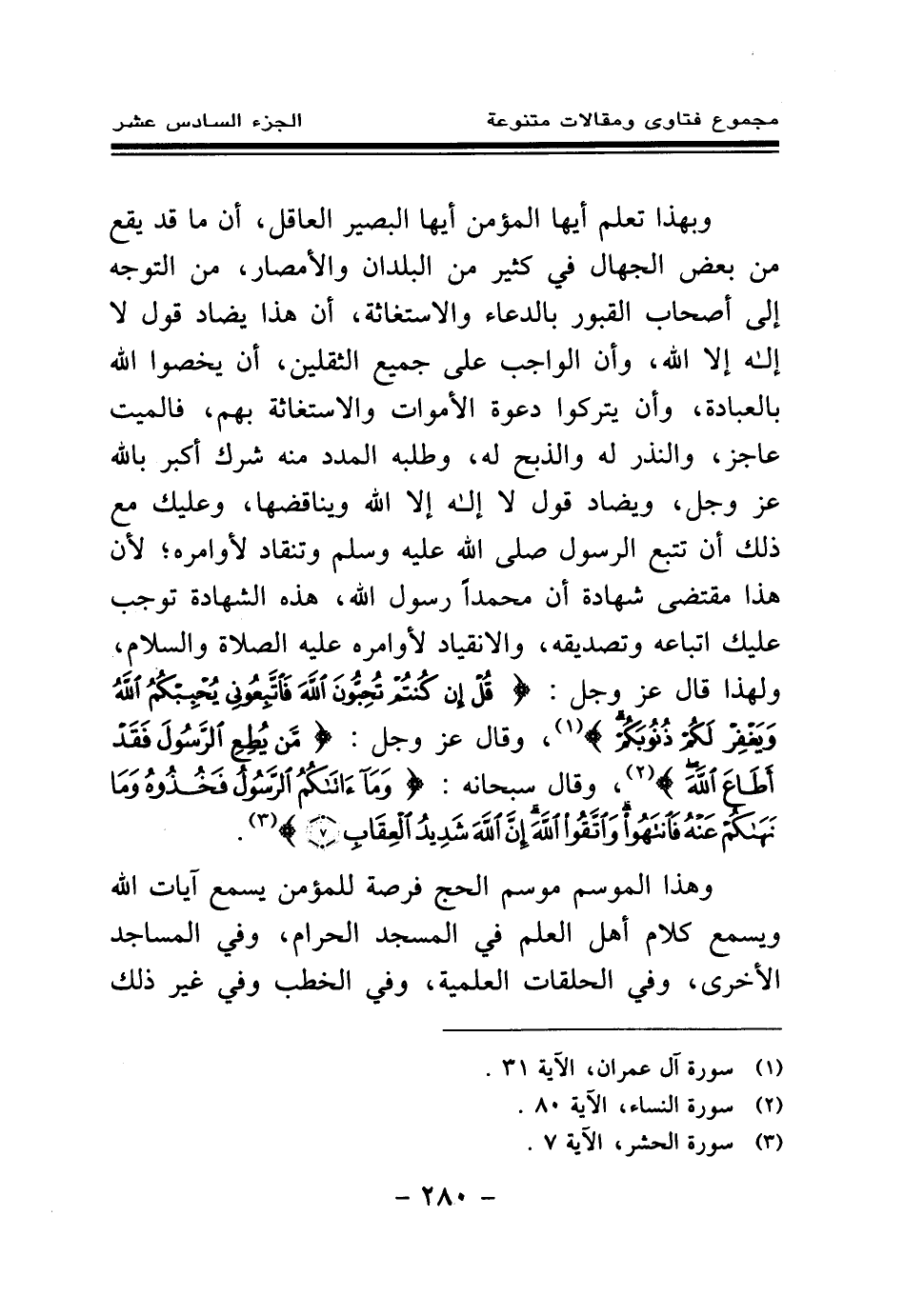 وبهذا تعلم أيها المؤمن أيها البصير العاقل، أن ما قد يقع من بعض الجهال في كثير من البلدان والأمصار، من التوجه إلى أصحاب القبور بالدعاء والاستغاثة، أن هذا يضاد قول لا إله إلا الله، وأن الواجب على جميع الثقلين، أن يخصوا الله بالعبادة، وأن يتركوا دعوة الأموات والاستغاثة بهم، فالميت عاجز، والنذر له والذبح له، وطلبه المدد منه شرك أكبر بالله عز وجل، ويضاد قول لا إله إلا الله ويناقضها، وعليك مع ذلك أن تتبع الرسول - صلى الله عليه وسلم - وتنقاد لأوامره؛ لأن هذا مقتضى شهادة أن محمدا رسول الله، هذه الشهادة توجب عليك اتباعه وتصديقه، والانقياد لأوامره - عليه الصلاة والسلام -، ولهذا قال عز وجل: {قُلْ إِنْ كُنْتُمْ تُحِبُّونَ اللَّهَ فَاتَّبِعُونِي يُحْبِبْكُمُ اللَّهُ وَيَغْفِرْ لَكُمْ ذُنُوبَكُمْ} (¬1) وقال عز وجل: {مَنْ يُطِعِ الرَّسُولَ فَقَدْ أَطَاعَ اللَّهَ} (¬2) وقال سبحانه: {وَمَا آتَاكُمُ الرَّسُولُ فَخُذُوهُ وَمَا نَهَاكُمْ عَنْهُ فَانْتَهُوا وَاتَّقُوا اللَّهَ إِنَّ اللَّهَ شَدِيدُ الْعِقَابِ} (¬3)