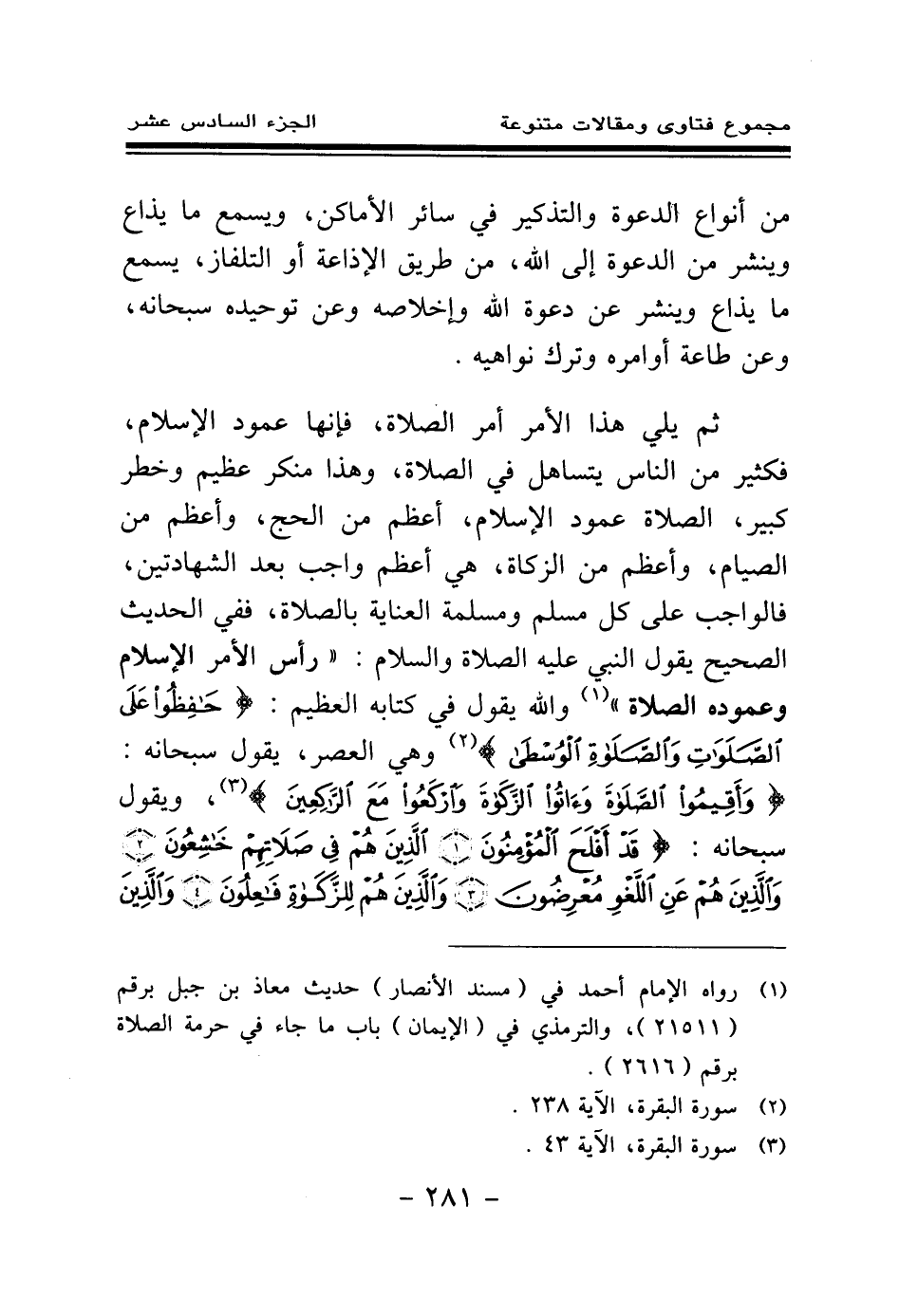 ثم يلي هذا الأمر أمر الصلاة، فإنها عمود الإسلام، فكثير من الناس يتساهل في الصلاة، وهذا منكر عظيم وخطر كبير، الصلاة عمود الإسلام، أعظم من الحج، وأعظم من الصيام، وأعظم من الزكاة، هي أعظم واجب بعد الشهادتين، فالواجب على كل مسلم ومسلمة العناية بالصلاة، ففي الحديث الصحيح يقول النبي - صلى الله عليه وسلم -: «رأس الأمر الإسلام وعموده الصلاة (¬1) » والله يقول في كتابه العظيم: {حَافِظُوا عَلَى الصَّلَوَاتِ وَالصَّلَاةِ الْوُسْطَى} (¬2) وهي العصر، يقول سبحانه: {وَأَقِيمُوا الصَّلَاةَ وَآتُوا الزَّكَاةَ وَارْكَعُوا مَعَ الرَّاكِعِينَ} (¬3) ويقول سبحانه: {قَدْ أَفْلَحَ الْمُؤْمِنُونَ} (¬4) {الَّذِينَ هُمْ فِي صَلَاتِهِمْ خَاشِعُونَ} (¬5) {وَالَّذِينَ هُمْ عَنِ اللَّغْوِ مُعْرِضُونَ} (¬6) {وَالَّذِينَ هُمْ لِلزَّكَاةِ فَاعِلُونَ} (¬7) {وَالَّذِينَ هُمْ لِفُرُوجِهِمْ حَافِظُونَ} (¬8) {إِلَّا عَلَى أَزْوَاجِهِمْ أوْ مَا مَلَكَتْ أَيْمَانُهُمْ فَإِنَّهُمْ غَيْرُ مَلُومِينَ} (¬9) {فَمَنِ ابْتَغَى وَرَاءَ ذَلِكَ فَأُولَئِكَ هُمُ الْعَادُونَ} (¬10) {وَالَّذِينَ هُمْ لِأَمَانَاتِهِمْ وَعَهْدِهِمْ رَاعُونَ} (¬11) {وَالَّذِينَ هُمْ عَلَى صَلَوَاتِهِمْ يُحَافِظُونَ} (¬12) {أُولَئِكَ هُمُ الْوَارِثُونَ} (¬13) {الَّذِينَ يَرِثُونَ الْفِرْدَوْسَ هُمْ فِيهَا خَالِدُونَ} (¬14)