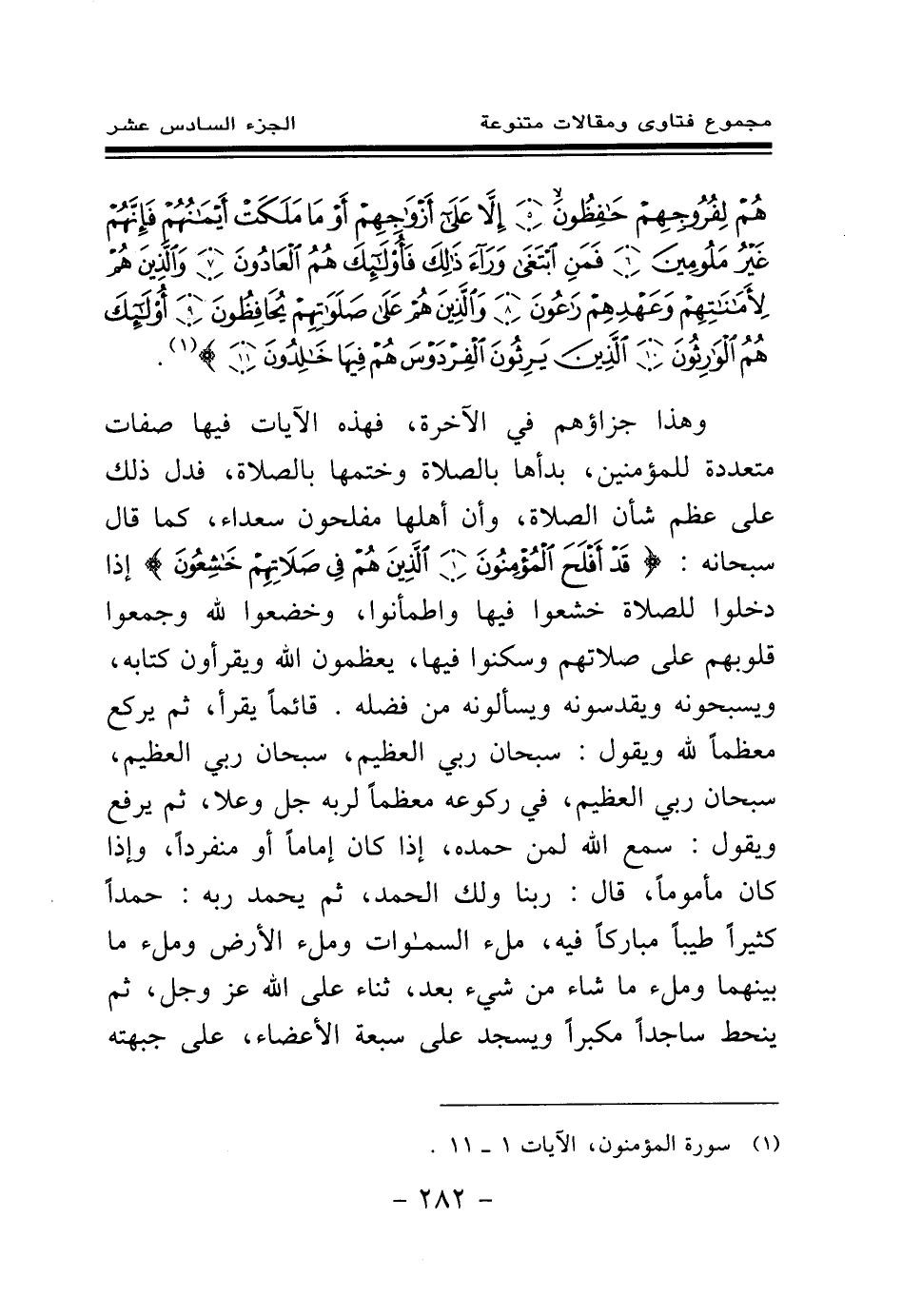 وهذا جزاؤهم في الآخرة، فهذه الآيات فيها صفات متعددة للمؤمنين، بدأها بالصلاة وختمها بالصلاة، فدل ذلك على عظم شأن الصلاة، وأن أهلها مفلحون سعداء، كما قال سبحانه: {قَدْ أَفْلَحَ الْمُؤْمِنُونَ} (¬1) {الَّذِينَ هُمْ فِي صَلَاتِهِمْ خَاشِعُونَ} (¬2) إذا دخلوا للصلاة خشعوا فيها واطمأنوا، وخضعوا لله وجمعوا قلوبهم على صلاتهم وسكنوا فيها، يعظمون الله ويقرءون كتابه، ويسبحونه ويقدسونه ويسألونه من فضله. قائما يقرأ، ثم يركع معظما لله ويقول: سبحان ربي العظيم، سبحان ربي العظيم، سبحان ربي العظيم، في ركوعه معظما لربه جل وعلا، ثم يرفع ويقول: سمع الله لمن حمده، إذا كان إماما أو منفردا، وإذا كان مأموما، قال: ربنا ولك الحمد، ثم يحمد ربه: حمدا كثيرا طيبا مباركا فيه، ملء السماوات وملء الأرض وملء ما بينهما وملء ما شئت من شيء بعد، ثناء على الله عز وجل، ثم ينحط ساجدا مكبرا ويسجد على سبعة الأعضاء، على جبهته