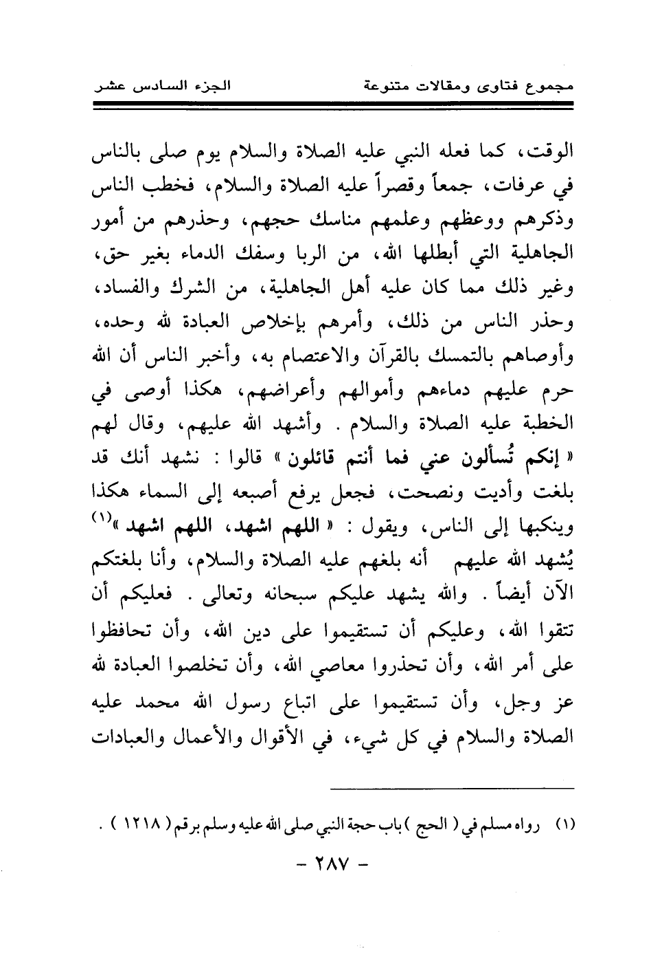 الوقت، كما فعله النبي - عليه الصلاة والسلام - يوم صلى بالناس في عرفات، جمعا وقصرا - عليه الصلاة والسلام -، فخطب الناس وذكرهم ووعظهم وعلمهم مناسك حجهم، وحذرهم من أمور الجاهلية التي أبطلها الله، من الربا وسفك الدم بغير حق، وغير ذلك مما كان عليه أهل الجاهلية، من الشرك والفساد، وحذر الناس من ذلك، وأمرهم بإخلاص العبادة لله وحده، وأوصاهم بالتمسك بالقرآن والاعتصام به، وأخبر الناس أن الله حرم عليهم دماءهم وأموالهم وأعراضهم، هكذا أوصى في الخطبة - عليه الصلاة والسلام -. وأشهد الله عليهم، «وقال لهم إنكم تسألون عني فما أنتم قائلون قالوا: نشهد أنك قد بلغت وأديت ونصحت، فجعل يرفع أصبعه إلى السماء هكذا وينكبها إلى الناس، ويقول: اللهم اشهد، اللهم اشهد (¬1) » يشهد الله عليهم أنه بلغهم - عليه الصلاة والسلام -، وأنا بلغتكم الآن أيضا. والله يشهد عليكم سبحانه وتعالى. فعليكم أن تتقوا الله، وعليكم أن تستقيموا على دين الله، وأن تحافظوا على أمر الله، وأن تحذروا معاصي الله، وأن تخلصوا العبادة لله عز وجل، وأن تستقيموا على اتباع رسول الله محمد - عليه الصلاة والسلام - في كل شيء، في الأقوال والأعمال والعبادات