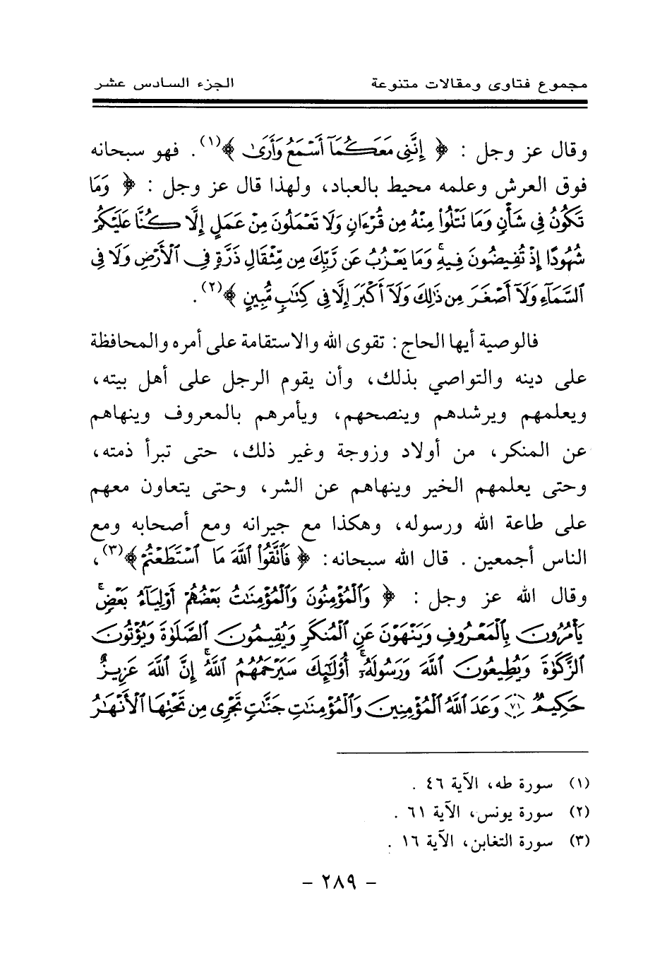 فالوصية أيها الحاج: تقوى الله والاستقامة على أمره والمحافظة على دينه والتواصي بذلك، وأن يقوم الرجل على أهل بيته، ويعلمهم ويرشدهم وينصحهم، ويأمرهم بالمعروف وينهاهم عن المنكر، من أولاد وزوجة وغير ذلك، حتى تبرأ ذمته، وحتى يعلمهم الخير وينهاهم عن الشر، وحتى يتعاون معهم على طاعة الله ورسوله، وهكذا مع جيرانه ومع أصحابه ومع الناس أجمعين. قال الله سبحانه: {فَاتَّقُوا اللَّهَ مَا اسْتَطَعْتُمْ} (¬3) وقال الله عز وجل: {وَالْمُؤْمِنُونَ وَالْمُؤْمِنَاتُ بَعْضُهُمْ أَوْلِيَاءُ بَعْضٍ يَأْمُرُونَ بِالْمَعْرُوفِ وَيَنْهَوْنَ عَنِ الْمُنْكَرِ وَيُقِيمُونَ الصَّلَاةَ وَيُؤْتُونَ الزَّكَاةَ وَيُطِيعُونَ اللَّهَ وَرَسُولَهُ أُولَئِكَ سَيَرْحَمُهُمُ اللَّهُ إِنَّ اللَّهَ عَزِيزٌ حَكِيمٌ} (¬4) {وَعَدَ اللَّهُ الْمُؤْمِنِينَ وَالْمُؤْمِنَاتِ جَنَّاتٍ تَجْرِي مِنْ تَحْتِهَا الْأَنْهَارُ خَالِدِينَ فِيهَا وَمَسَاكِنَ طَيِّبَةً فِي جَنَّاتِ عَدْنٍ وَرِضْوَانٌ مِنَ اللَّهِ أَكْبَرُ ذَلِكَ هُوَ الْفَوْزُ الْعَظِيمُ} (¬5)