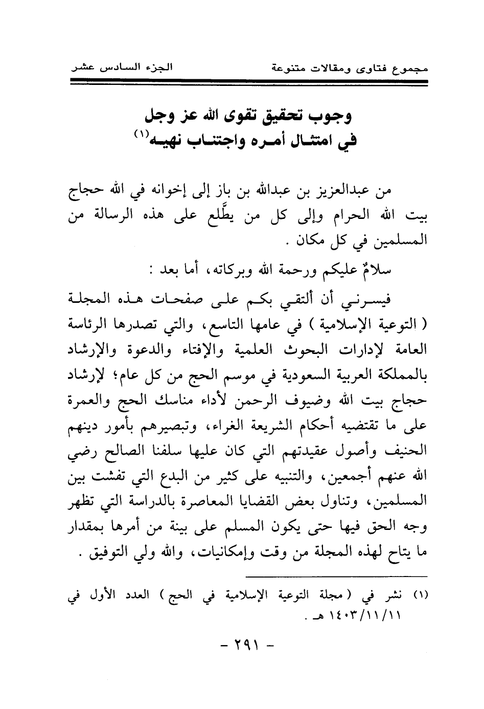 من عبد العزيز بن عبد الله بن باز إلى إخوانه في الله حجاج بيت الله الحرام وإلى كل من يطلع على هذه الرسالة من المسلمين في كل مكان.