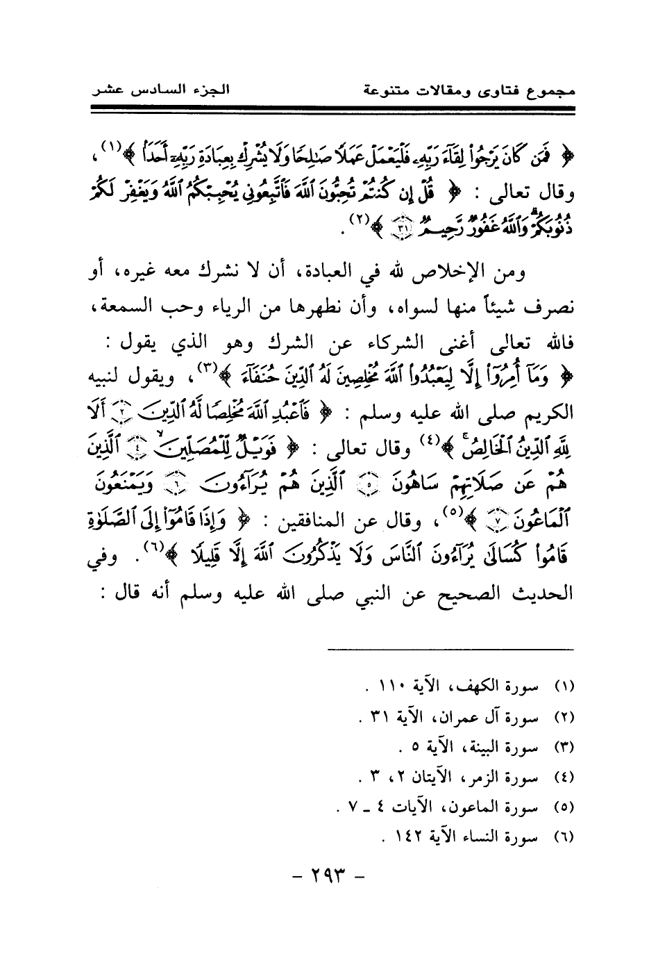 ومن الإخلاص لله في العبادة، أن لا نشرك معه غيره، أو نصرف شيئا منها لسواه، وأن نطهرها من الرياء وحب السمعة، فالله تعالى أغنى الشركاء عن الشرك وهو الذي يقول: {وَمَا أُمِرُوا إِلَّا لِيَعْبُدُوا اللَّهَ مُخْلِصِينَ لَهُ الدِّينَ حُنَفَاءَ} (¬3) ويقول لنبيه الكريم - صلى الله عليه وسلم -: {فَاعْبُدِ اللَّهَ مُخْلِصًا لَهُ الدِّينَ} (¬4) {أَلَا لِلَّهِ الدِّينُ الْخَالِصُ} (¬5) وقال تعالى: {فَوَيْلٌ لِلْمُصَلِّينَ} (¬6) {الَّذِينَ هُمْ عَنْ صَلَاتِهِمْ سَاهُونَ} (¬7) {الَّذِينَ هُمْ يُرَاءُونَ} (¬8) {وَيَمْنَعُونَ الْمَاعُونَ} (¬9) وقال عن المنافقين: {وَإِذَا قَامُوا إِلَى الصَّلَاةِ قَامُوا كُسَالَى يُرَاءُونَ النَّاسَ وَلَا يَذْكُرُونَ اللَّهَ إِلَّا قَلِيلًا} (¬10) وفي الحديث الصحيح عن النبي - صلى الله عليه وسلم - أنه قال