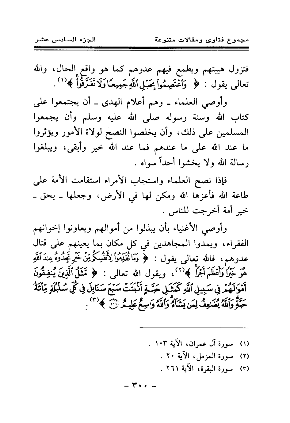 وأوصي الأغنياء بأن يبذلوا من أموالهم ويعاونوا إخوانهم الفقراء، ويمدوا المجاهدين في كل مكان بما يعينهم على قتال عدوهم، فالله تعالى يقول: {وَمَا تُقَدِّمُوا لِأَنْفُسِكُمْ مِنْ خَيْرٍ تَجِدُوهُ عِنْدَ اللَّهِ هُوَ خَيْرًا وَأَعْظَمَ أَجْرًا} (¬2) ويقول الله تعالى: {مَثَلُ الَّذِينَ يُنْفِقُونَ أَمْوَالَهُمْ فِي سَبِيلِ اللَّهِ كَمَثَلِ حَبَّةٍ أَنْبَتَتْ سَبْعَ سَنَابِلَ فِي كُلِّ سُنْبُلَةٍ مِائَةُ حَبَّةٍ وَاللَّهُ يُضَاعِفُ لِمَنْ يَشَاءُ وَاللَّهُ وَاسِعٌ عَلِيمٌ} (¬3)