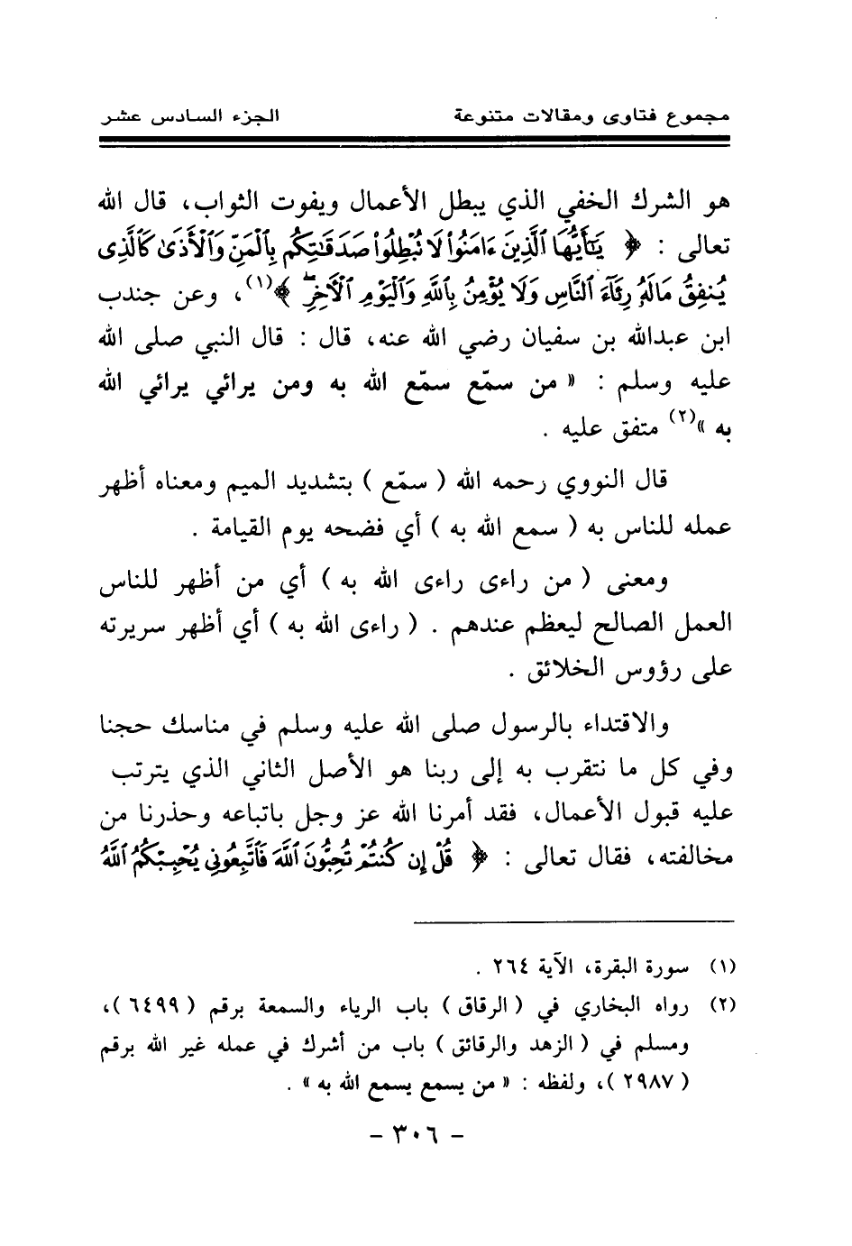 (¬2) رواه البخاري في (الرقاق) باب الرياء والسمعة برقم (6499) ، ومسلم في (الزهد والرقائق) باب من أشرك في عمله غير الله برقم (2987) ، ولفظه: '' من يسمع يسمع الله به''.
