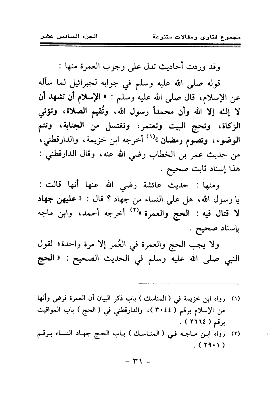(¬1) رواه ابن خزيمة في (المناسك) باب ذكر البيان أن العمرة فرض وأنها من الإسلام برقم (3044) ، والدارقطني في (الحج) باب المواقيت برقم (2664) .