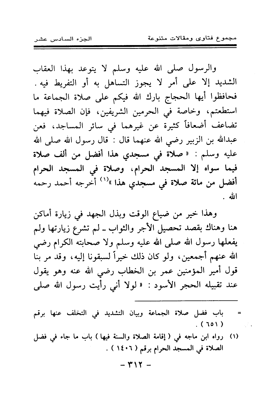 فحافظوا أيها الحجاج بارك الله فيكم على صلاة الجماعة ما استطعتم، وخاصة في الحرمين الشريفين، فإن الصلاة فيهما تضاعف أضعافا كثيرة عن غيرهما في سائر المساجد، فعن عبد الله بن الزبير - رضي الله عنهما - قال: قال رسول الله - صلى الله عليه وسلم -: «صلاة في مسجدي هذا أفضل من ألف صلاة فيما سواه إلا المسجد الحرام، وصلاة في المسجد الحرام أفضل من مائة صلاة في مسجدي هذا (¬1) » أخرجه أحمد - رحمه الله -.