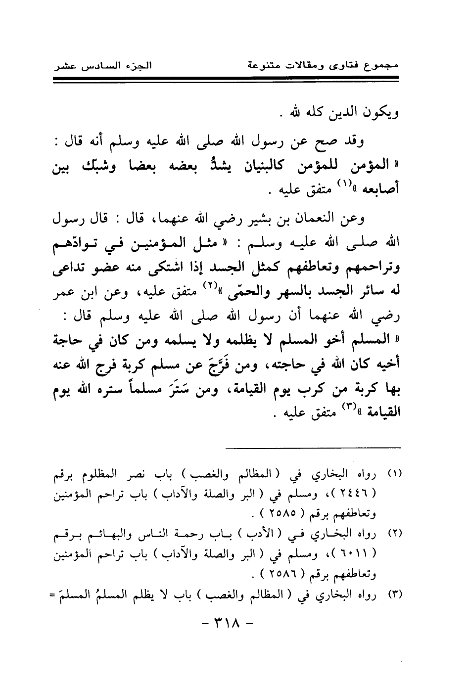 وعن النعمان بن بشير - رضي الله عنهما -، قال: قال رسول الله - صلى الله عليه وسلم -: «مثل المؤمنين في توادهم وتراحمهم وتعاطفهم كمثل الجسد إذا اشتكى منه عضو تداعى له سائر الجسد بالسهر والحمى (¬2) » متفق عليه، وعن ابن عمر - رضي الله عنهما - أن رسول الله - صلى الله عليه وسلم - قال: «المسلم أخو المسلم لا يظلمه ولا يسلمه ومن كان في حاجة أخيه كان الله في حاجته، ومن فرج عن مسلم كربة فرج الله عنه بها كربة من كرب يوم القيامة، ومن ستر مسلما ستره الله يوم القيامة (¬3) » متفق عليه.