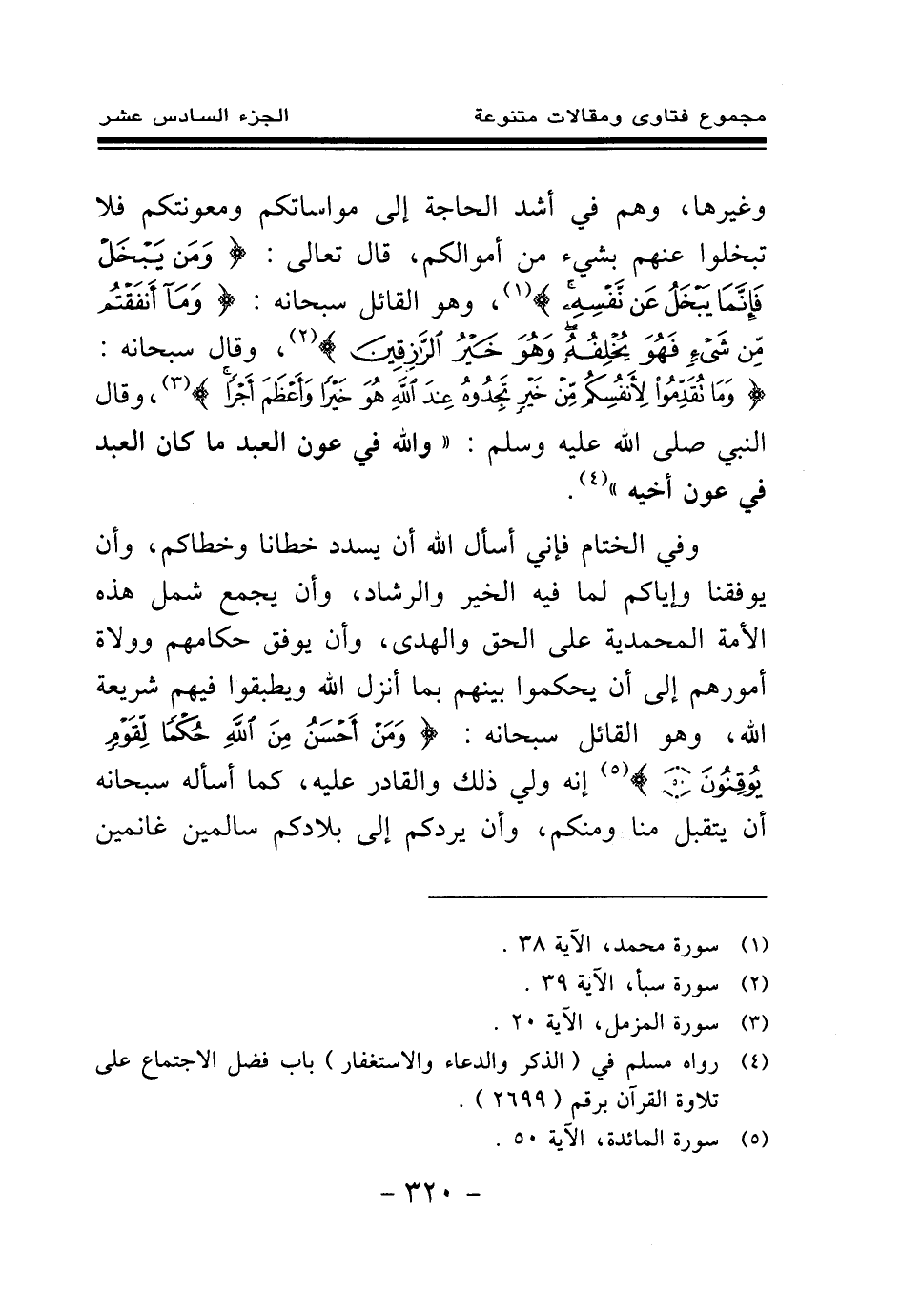 وفي الختام فإني أسأل الله أن يسدد خطانا وخطاكم، وأن يوفقنا وإياكم لما فيه الخير والرشاد، وأن يجمع شمل هذه الأمة المحمدية على الحق والهدى، وأن يوفق حكامهم وولاة أمورهم إلى أن يحكموا بينهم بما أنزل الله ويطبقوا فيهم شريعة الله، وهو القائل سبحانه: {وَمَنْ أَحْسَنُ مِنَ اللَّهِ حُكْمًا لِقَوْمٍ يُوقِنُونَ} (¬5) إنه ولي ذلك والقادر عليه، كما أسأله سبحانه أن يتقبل منا ومنكم، وأن يردكم إلى بلادكم سالمين غانمين