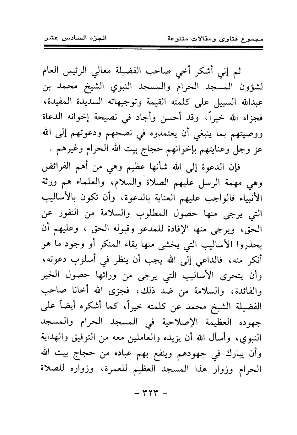 فإن الدعوة إلى الله شأنها عظيم وهي من أهم الفرائض وهي مهمة الرسل - عليهم الصلاة والسلام -، والعلماء هم ورثة الأنبياء فالواجب عليهم العناية بالدعوة، وأن تكون بالأساليب التي يرجى منها حصول المطلوب والسلامة من النفور عن الحق، ويرجى منها الإفادة للمدعو وقبوله الحق، وعليهم أن يحذروا الأساليب التي يخشى منها بقاء المنكر أو وجود ما هو أنكر منه، فالداعي إلى الله يجب أن ينظر في أسلوب دعوته، وأن يتحرى الأساليب التي يرجى من ورائها حصول الخير والفائدة، والسلامة من ضد ذلك، فجزى الله أخانا صاحب الفضيلة الشيخ محمد عن كلمته خيرا، كما أشكره أيضا على جهوده العظيمة الإصلاحية في المسجد الحرام والمسجد النبوي، وأسأل الله أن يزيده والعاملين معه من التوفيق والهداية وأن يبارك في جهودهم وينفع بها عباده من حجاج بيت الله الحرام وزوار هذا المسجد العظيم للعمرة، وزواره للصلاة