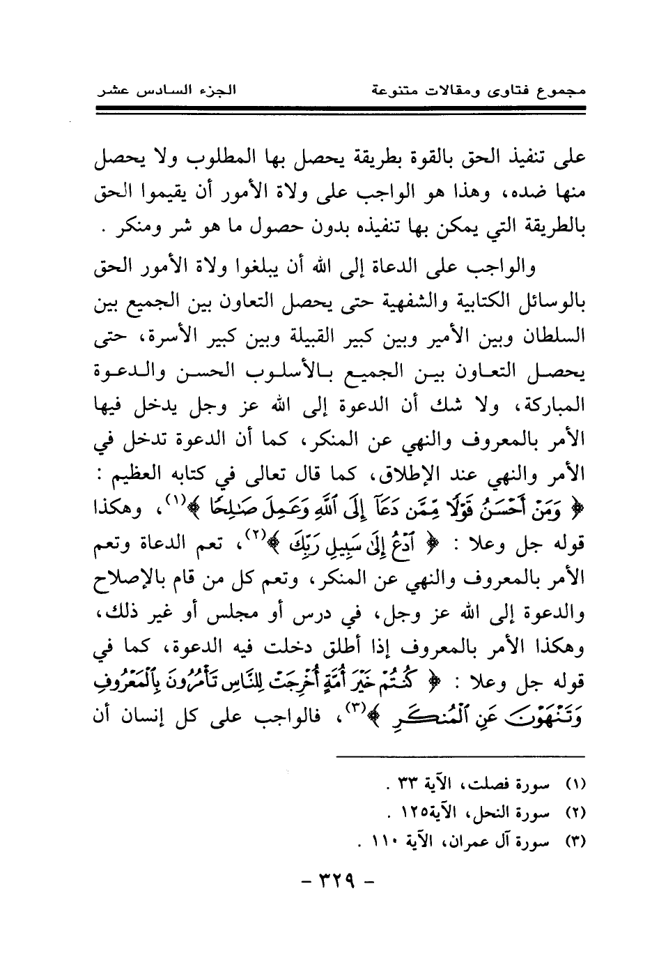 والواجب على الدعاة إلى الله أن يبلغوا ولاة الأمور الحق بالوسائل الكتابية والشفهية حتى يحصل التعاون بين الجميع بين السلطان وبين الأمير وبين كبير القبيلة وبين كبير الأسرة، حتى يحصل التعاون بين الجميع بالأسلوب الحسن والدعوة المباركة، ولا شك أن الدعوة إلى الله عز وجل يدخل فيها الأمر بالمعروف والنهي عن المنكر، كما أن الدعوة تدخل فيها الأمر والنهي عند الإطلاق، كما قال تعالى في كتابه العظيم: {وَمَنْ أَحْسَنُ قَوْلًا مِمَّنْ دَعَا إِلَى اللَّهِ وَعَمِلَ صَالِحًا} (¬1) وهكذا قوله جل وعلا: {ادْعُ إِلَى سَبِيلِ رَبِّكَ} (¬2) تعم الدعاة وتعم الأمر بالمعروف والنهي عن المنكر، وتعم كل من قام بالإصلاح والدعوة إلى الله عز وجل، في درس أو مجلس أو غير ذلك، وهكذا الأمر بالمعروف إذا أطلق دخلت فيه الدعوة، كما في قوله جل وعلا: {كُنْتُمْ خَيْرَ أُمَّةٍ أُخْرِجَتْ لِلنَّاسِ تَأْمُرُونَ بِالْمَعْرُوفِ وَتَنْهَوْنَ عَنِ الْمُنْكَرِ} (¬3) فالواجب على كل إنسان أن
