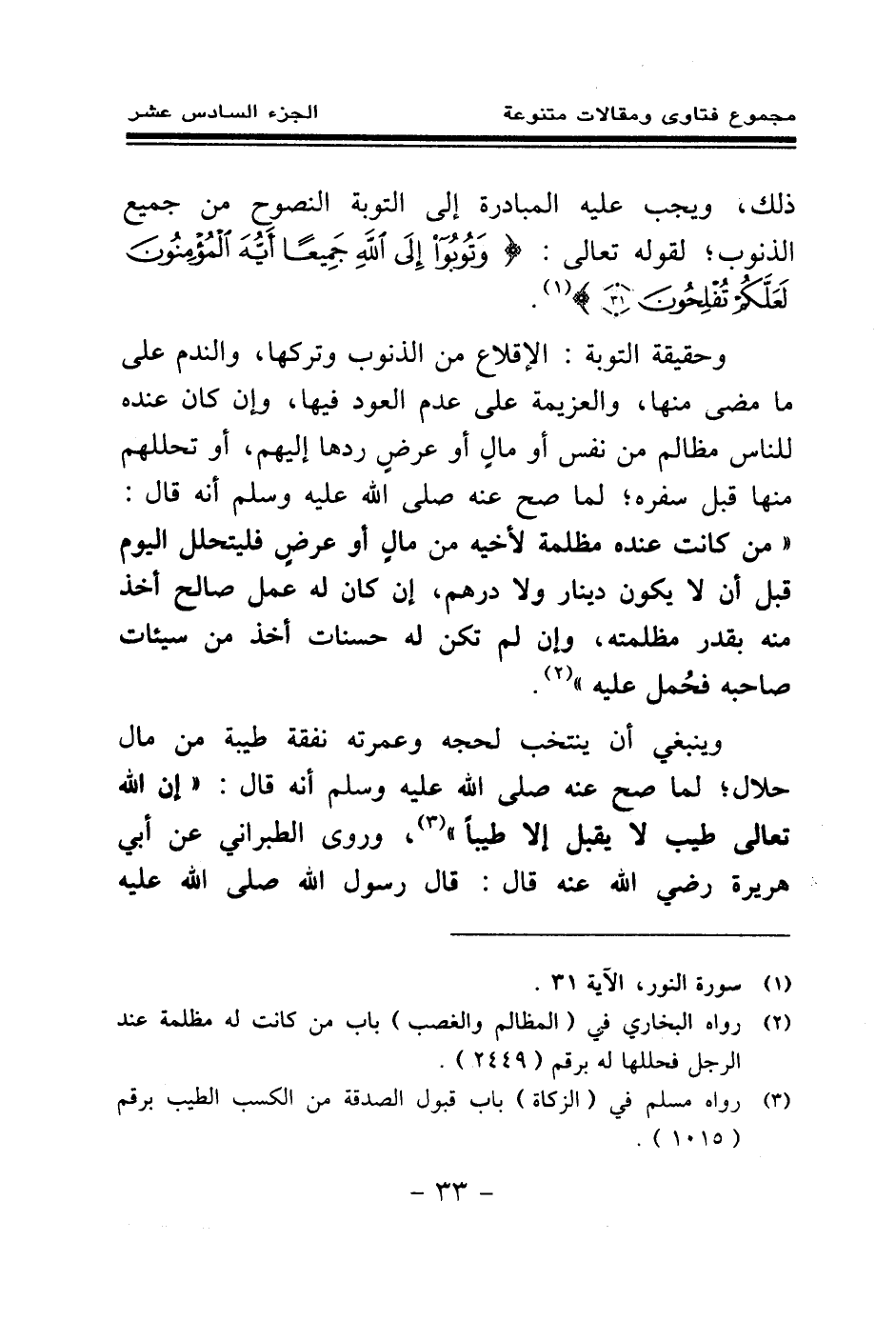وحقيقة التوبة: الإقلاع من الذنوب وتركها، والندم على ما مضى منها، والعزيمة على عدم العود فيها، وإن كان عنده للناس مظالم من نفس أو مال أو عرض ردها إليهم، أو تحللهم منها قبل سفره؛ لما صح عنه صلى الله عليه وسلم أنه قال: «من كانت عنده مظلمة لأخيه من مال أو عرض فليتحلل اليوم قبل أن لا يكون دينار ولا درهم، إن كان له عمل صالح أخذ منه بقدر مظلمته، وإن لم تكن له حسنات أخذ من سيئات صاحبه فحمل عليه (¬2) » .