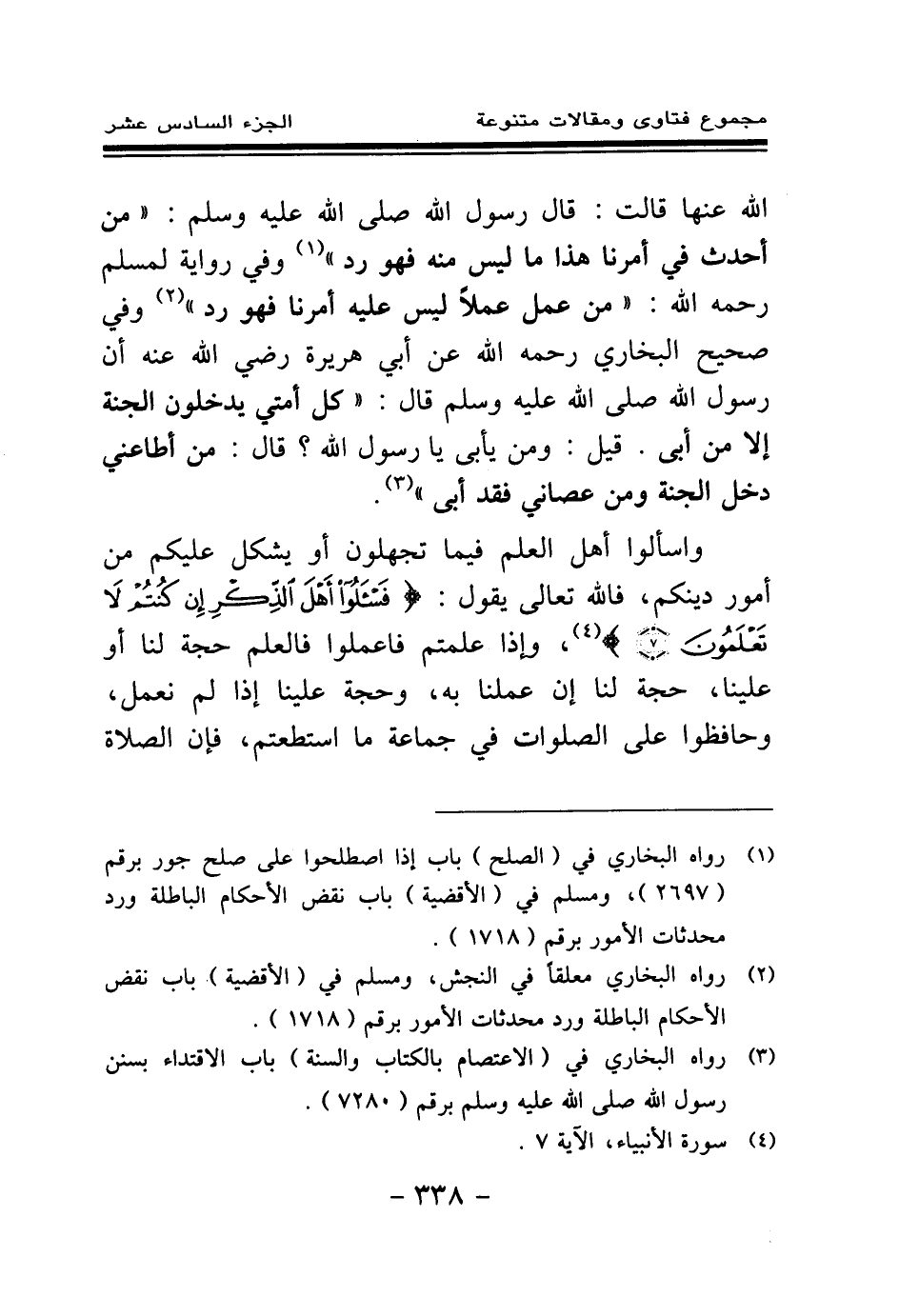 (¬3) رواه البخاري في (الاعتصام بالكتاب والسنة) باب الاقتداء بسنن رسول الله - صلى الله عليه وسلم - برقم (7280) .