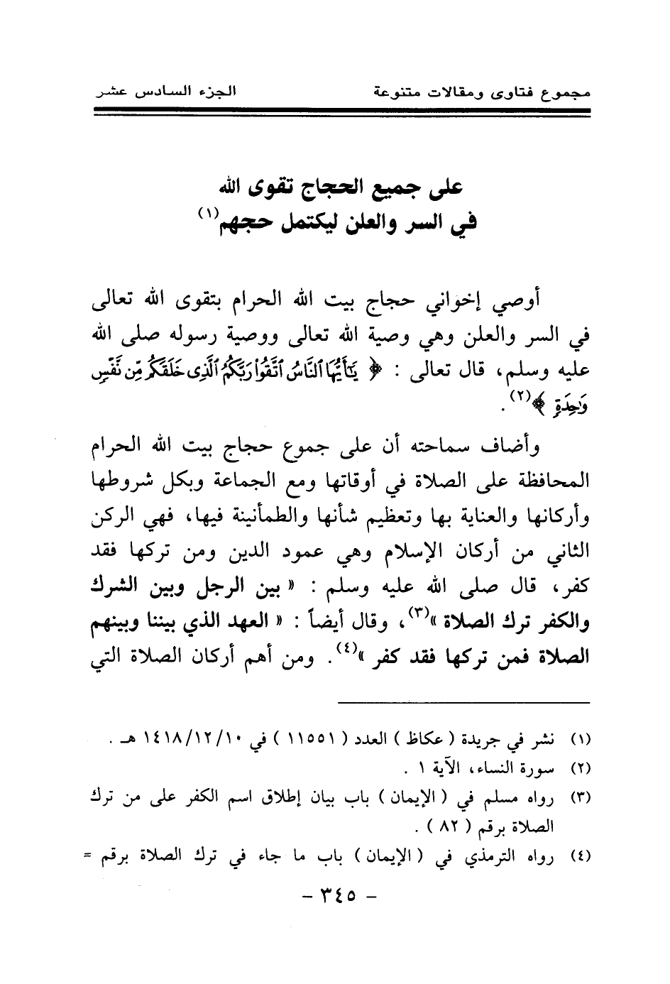 على جميع الحجاج تقوى الله في السر والعلن ليكتمل حجهم (¬1) .