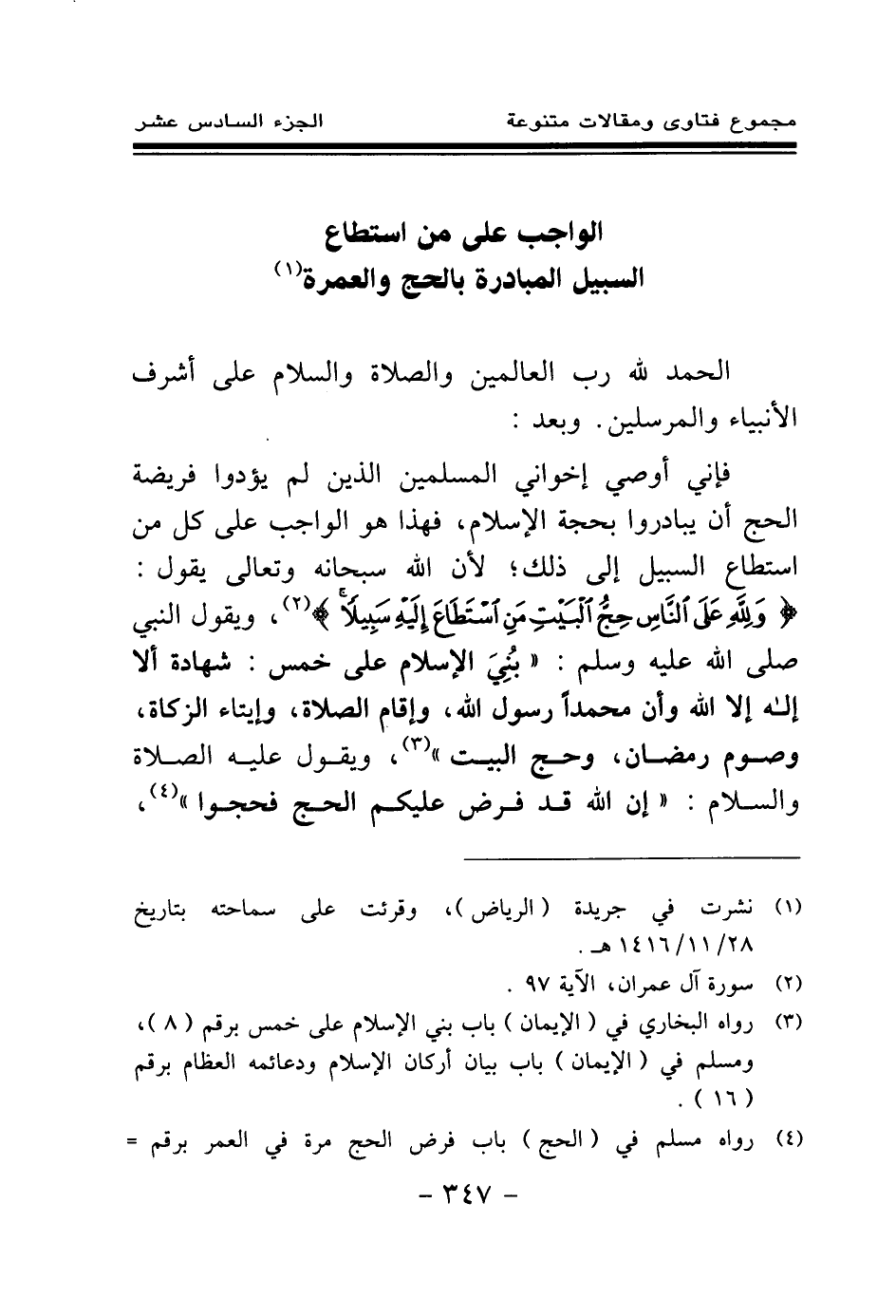 فإني أوصي إخواني المسلمين الذين لم يؤدوا فريضة الحج أن يبادروا بحجة الإسلام، فهذا هو الواجب على كل من استطاع السبيل إلى ذلك؛ لأن الله سبحانه وتعالى يقول: {وَلِلَّهِ عَلَى النَّاسِ حِجُّ الْبَيْتِ مَنِ اسْتَطَاعَ إِلَيْهِ سَبِيلًا} (¬2) ويقول النبي - صلى الله عليه وسلم -: «بني الإسلام على خمس: شهادة أن لا إله إلا الله وأن محمدا رسول الله، وإقام الصلاة، وإيتاء الزكاة، وصوم رمضان، وحج البيت (¬3) » ، ويقول - عليه الصلاة والسلام -: «إن الله قد فرض عليكم الحج فحجوا (¬4) » .