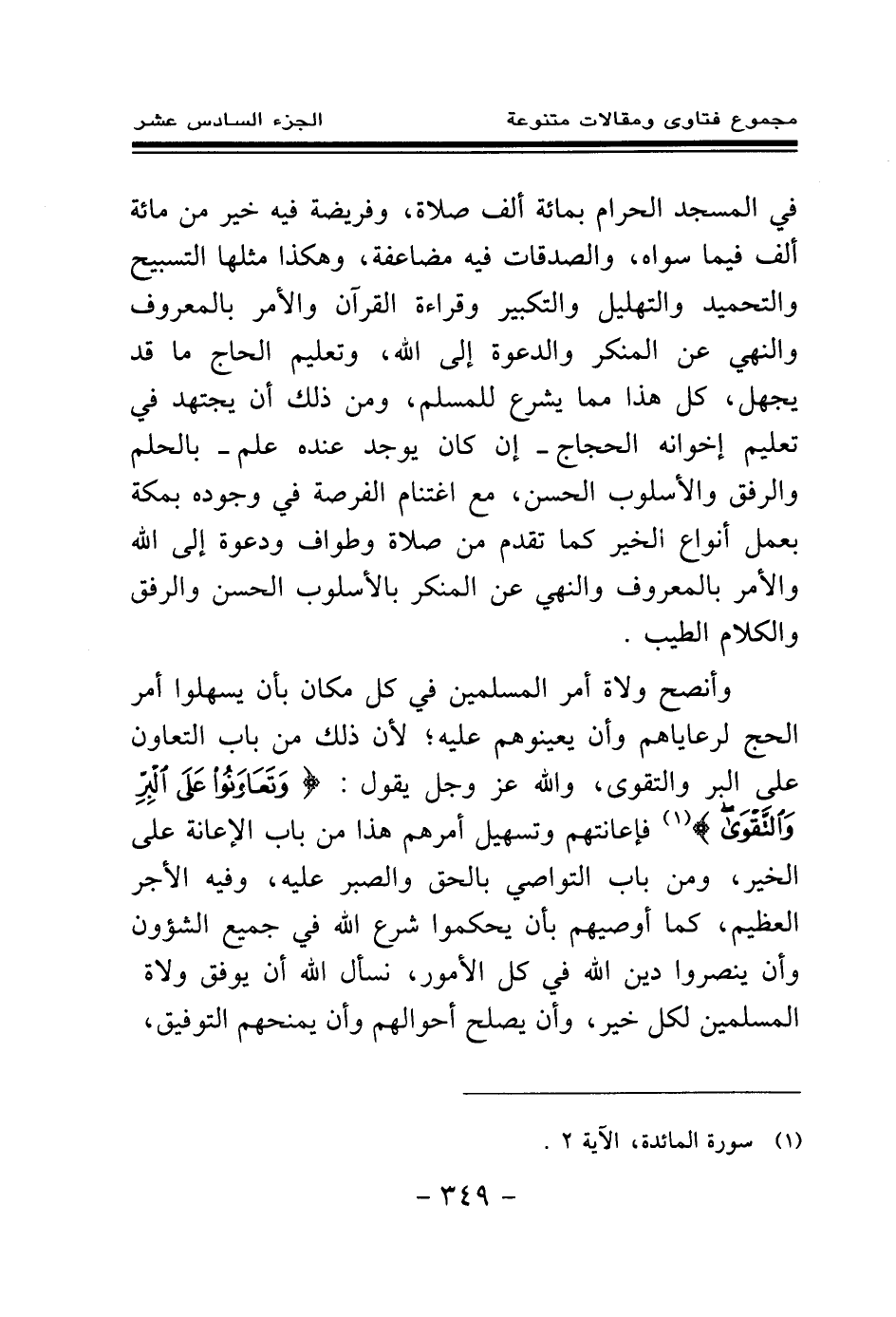 وأنصح ولاة أمر المسلمين في كل مكان بأن يسهلوا أمر الحج لرعاياهم وأن يعينوهم عليه؛ لأن ذلك من باب التعاون على البر والتقوى، والله عز وجل يقول: {وَتَعَاوَنُوا عَلَى الْبِرِّ وَالتَّقْوَى} (¬1) فإعانتهم وتسهيل أمرهم هذا من باب الإعانة على الخير، ومن باب التواصي بالحق والصبر عليه، وفيه الأجر العظيم، كما أوصيهم بأن يحكموا شرع الله في جميع الشئون وأن ينصروا دين الله في كل الأمور، نسأل الله أن يوفق ولاة المسلمين لكل خير، وأن يصلح أحوالهم وأن يمنحهم التوفيق،