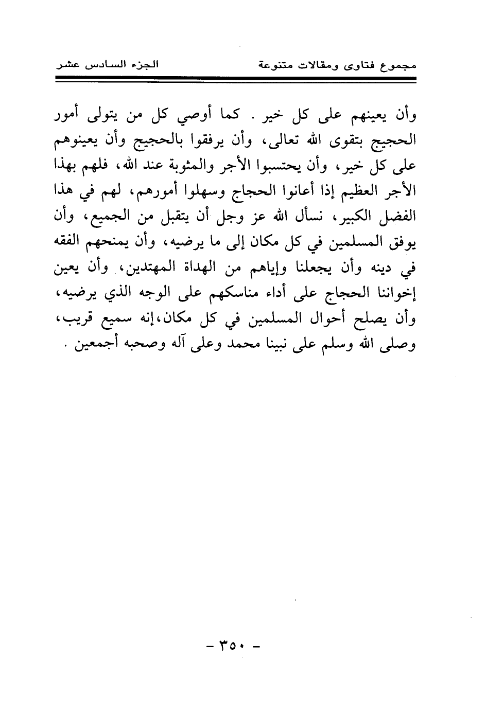 وأن يعينهم على كل خير. كما أوصي كل من يتولى أمور الحجيج بتقوى الله تعالى، وأن يرفقوا بالحجيج وأن يعينوهم على كل خير، وأن يحتسبوا الأجر والمثوبة عند الله، فلهم بهذا الأجر العظيم إذا أعانوا الحجاج وسهلوا أمورهم، لهم في هذا الفضل الكبير، نسأل الله عز وجل أن يتقبل من الجميع، وأن يوفق المسلمين في كل مكان إلى ما يرضيه، وأن يمنحهم الفقه في دينه وأن يجعلنا وإياهم من الهداة المهتدين، وأن يعين إخواننا الحجاج على أداء مناسكهم على الوجه الذي يرضيه، وأن يصلح أحوال المسلمين في كل مكان، إنه سميع قريب، وصلى الله وسلم على نبينا محمد وعلى آله وصحبه أجمعين.
