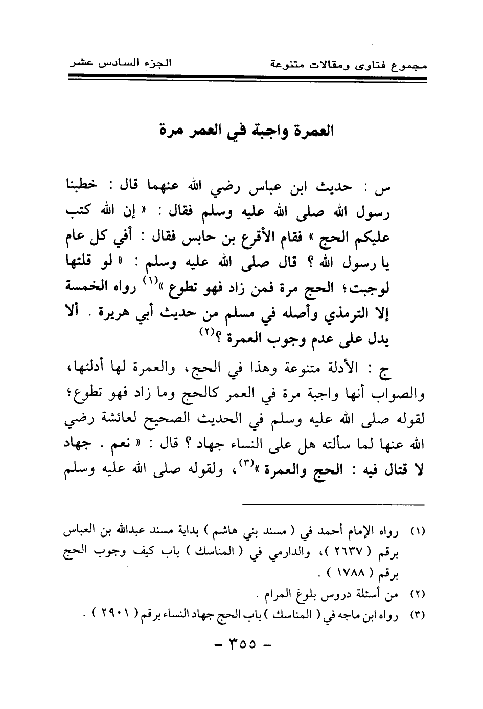 ج: الأدلة متنوعة وهذا في الحج، والعمرة لها أدلتها، والصواب أنها واجبة مرة في العمر كالحج وما زاد فهو تطوع؛ «لقوله - صلى الله عليه وسلم - في الحديث الصحيح لعائشة - رضي الله عنها - لما سألته هل على النساء جهاد؟ قال: نعم. جهاد لا قتال فيه: الحج والعمرة (¬3) » ، «ولقوله - صلى الله عليه وسلم -