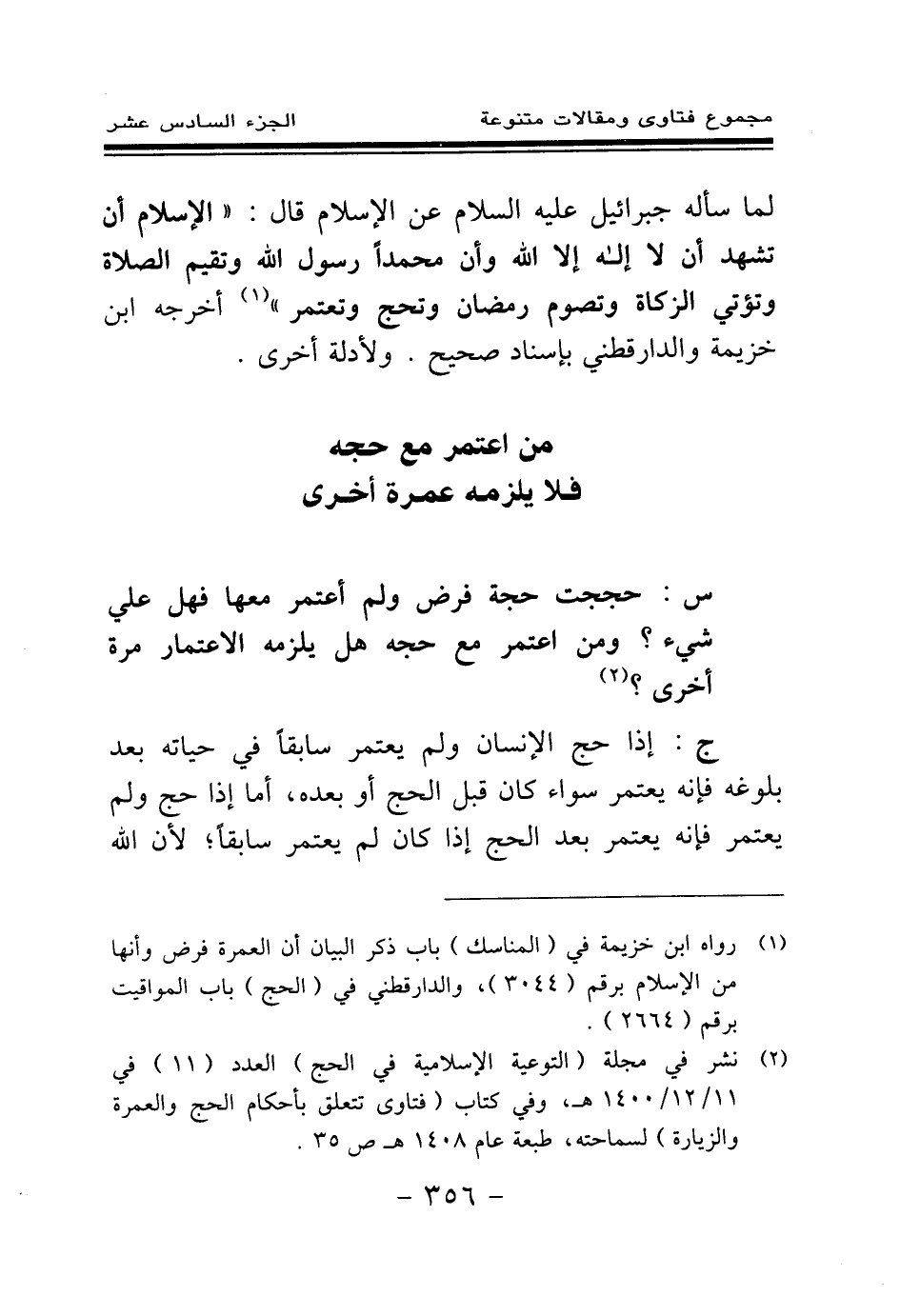 لما سأله جبرائيل - عليه السلام - عن الإسلام قال: الإسلام أن تشهد أن لا إله إلا الله وأن محمدا رسول الله وتقيم الصلاة وتؤتي الزكاة وتصوم رمضان وتحج وتعتمر (¬1) » . أخرجه ابن خزيمة والدارقطني بإسناد صحيح. ولأدلة أخرى.