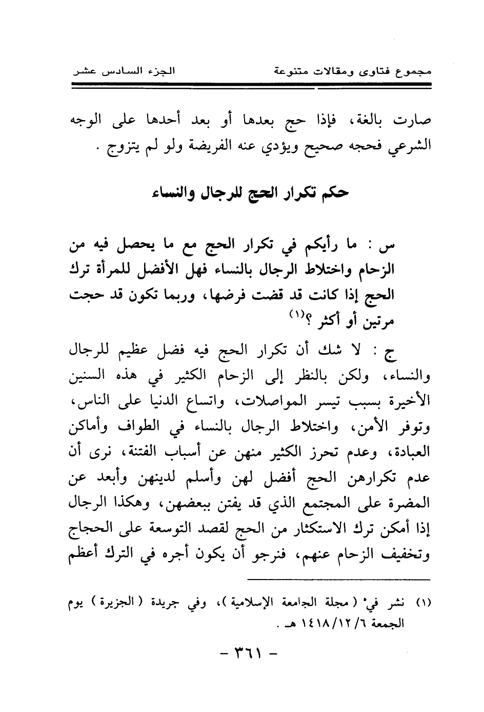 ج: لا شك أن تكرار الحج فيه فضل عظيم للرجال والنساء، ولكن بالنظر إلى الزحام الكثير في هذه السنين الأخيرة بسبب تيسر المواصلات، واتساع الدنيا على الناس، وتوفر الأمن، واختلاط الرجال بالنساء في الطواف وأماكن العبادة، وعدم تحرز الكثير منهن عن أسباب الفتنة، نرى أن عدم تكرارهن الحج أفضل لهن وأسلم لدينهن وأبعد عن المضرة على المجتمع الذي قد يفتن ببعضهن، وهكذا الرجال إذا أمكن ترك الاستكثار من الحج لقصد التوسعة على الحجاج وتخفيف الزحام عنهم، فنرجو أن يكون أجره في الترك أعظم