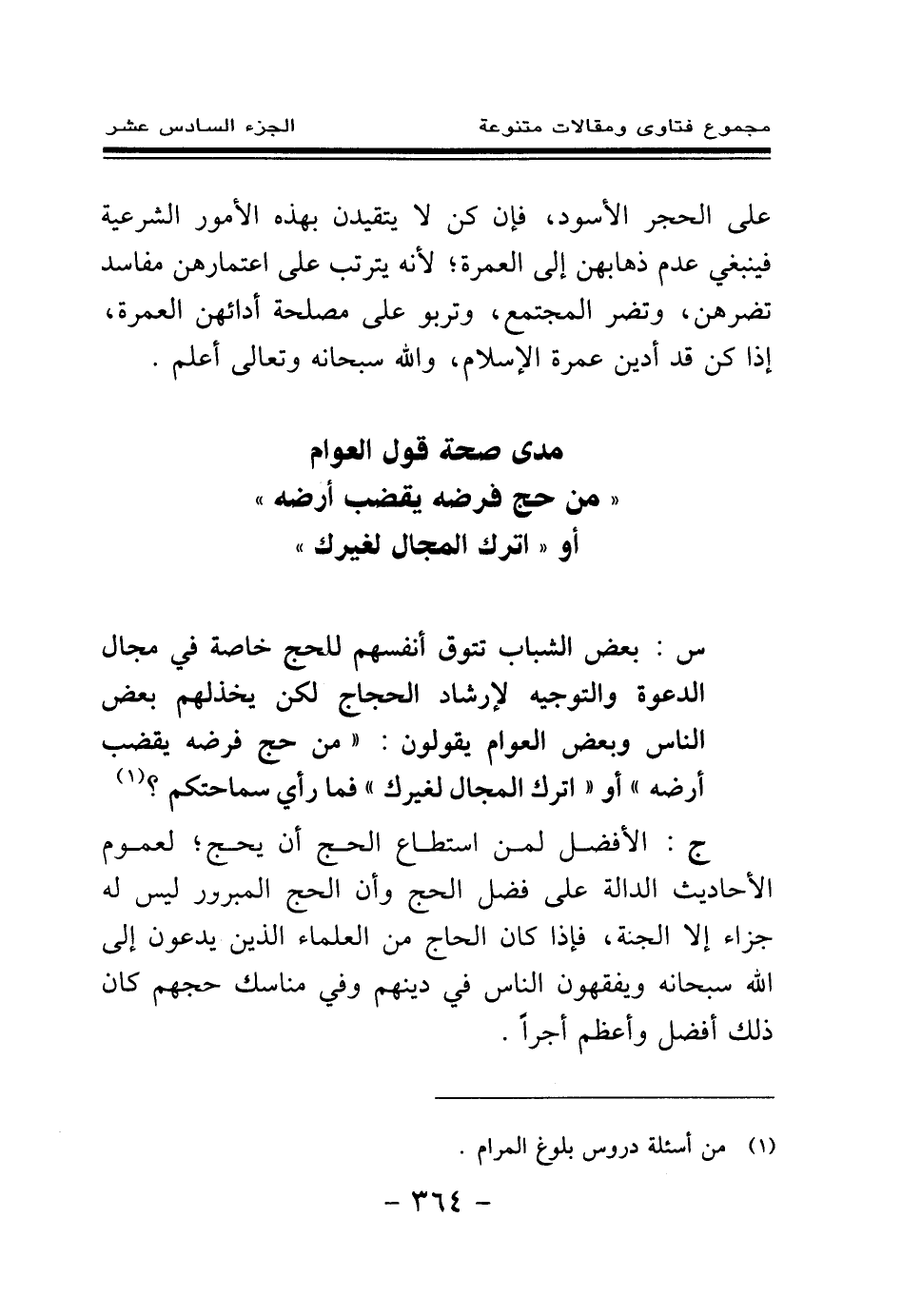 س: بعض الشباب تتوق أنفسهم للحج خاصة في مجال الدعوة والتوجيه لإرشاد الحجاج لكن يخذلهم بعض الناس وبعض العوام يقولون: " من حج فرضه يقضب أرضه " أو " اترك المجال لغيرك" فما رأي سماحتكم؟ (¬1) .