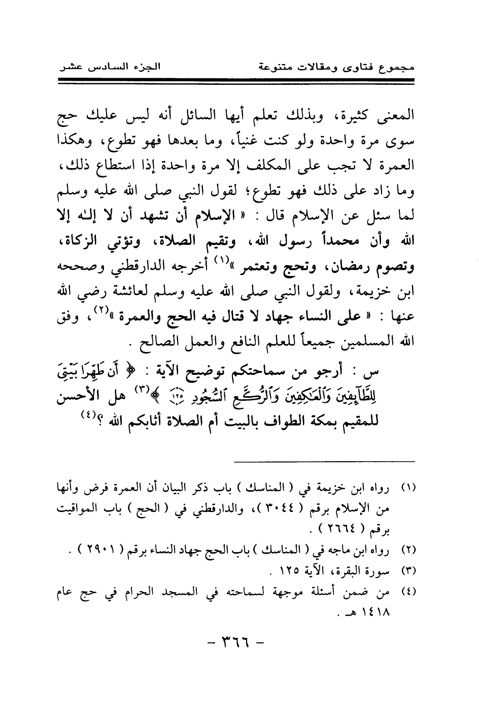 (¬1) رواه ابن خزيمة في (المناسك) باب ذكر البيان أن العمرة فرض وأنها من الإسلام برقم (3044) ، والدارقطني في (الحج) باب المواقيت برقم (2664) .