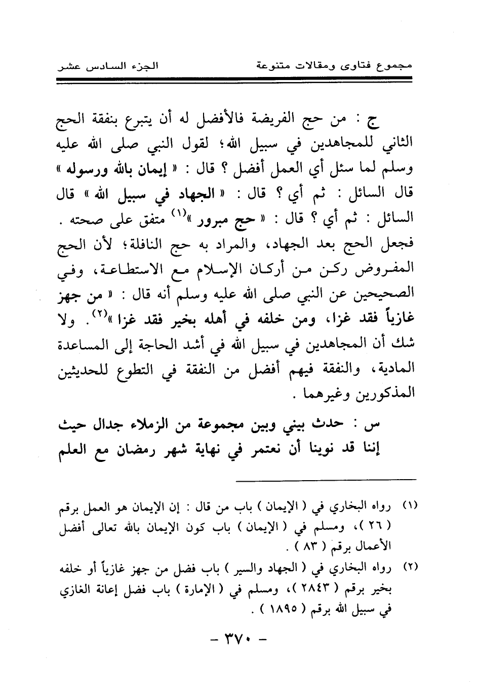 فجعل الحج بعد الجهاد، والمراد به حج النافلة؛ لأن الحج المفروض ركن من أركان الإسلام مع الاستطاعة، وفي الصحيحين عن النبي - صلى الله عليه وسلم - أنه قال: «من جهز غازيا فقد غزا، ومن خلفه في أهله بخير فقد غزا (¬2) » ولا شك أن المجاهدين في سبيل الله في أشد الحاجة إلى المساعدة المادية، والنفقة فيهم أفضل من النفقة في التطوع للحديثين المذكورين وغيرهما.