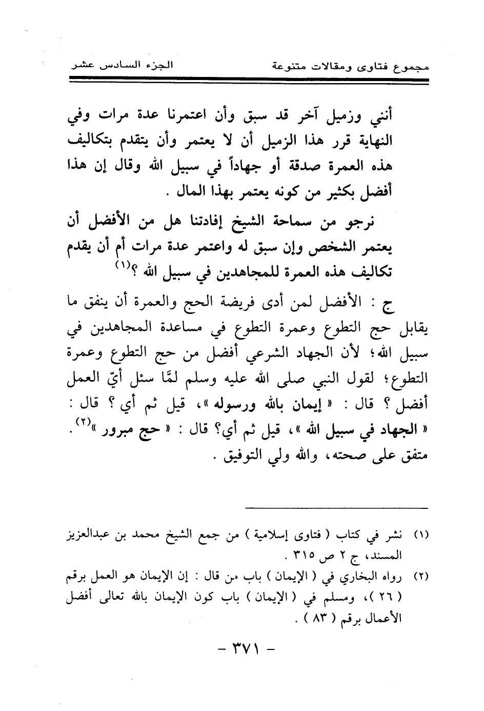 نرجو من سماحة الشيخ إفادتنا هل من الأفضل أن يعتمر الشخص وإن سبق له واعتمر عدة مرات أم أن يقدم تكاليف هذه العمرة للمجاهدين في سبيل الله؟ (¬1) .