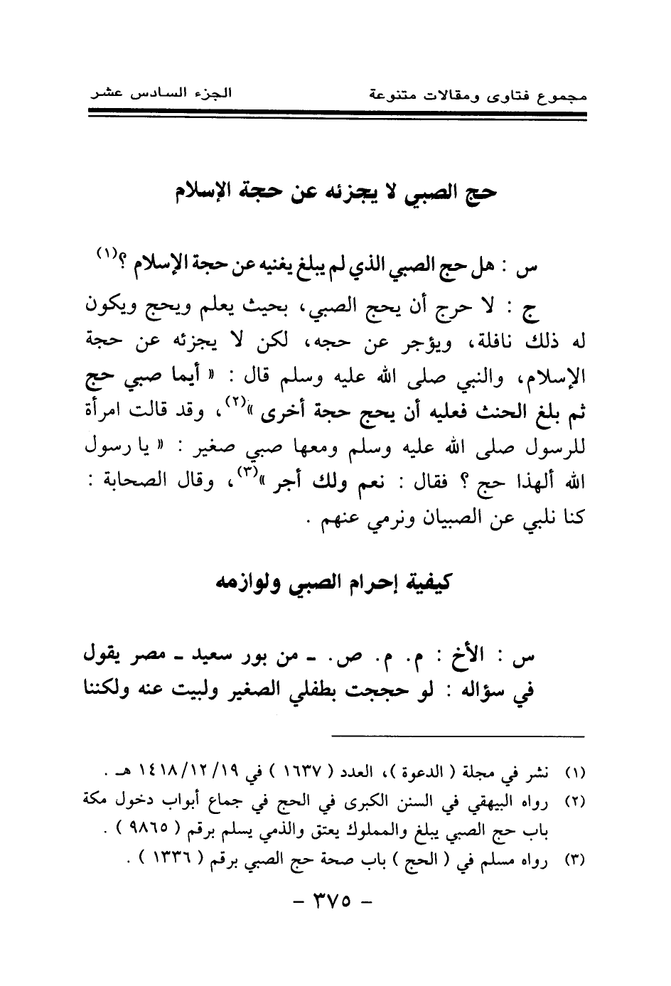 س: الأخ: م. م. ص. - من بور سعيد - مصر يقول في سؤاله: لو حججت بطفلي الصغير ولبيت عنه ولكننا