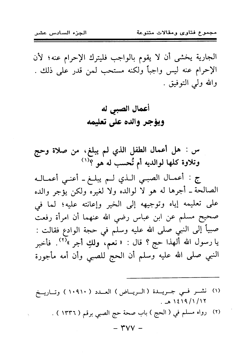 ج: أعمال الصبي الذي لم يبلغ - أعني أعماله الصالحة - أجرها له هو لا لوالده ولا لغيره ولكن يؤجر والده على تعليمه إياه وتوجيهه إلى الخير وإعانته عليه؛ لما في صحيح مسلم عن ابن عباس - رضي الله عنهما - أن امرأة رفعت صبيا إلى النبي - صلى الله عليه وسلم - في حجة الوداع فقالت: «يا رسول الله ألهذا حج؟ قال: نعم، ولك أجر (¬2) » . فأخبر النبي - صلى الله عليه وسلم - أن الحج للصبي وأن أمه مأجورة