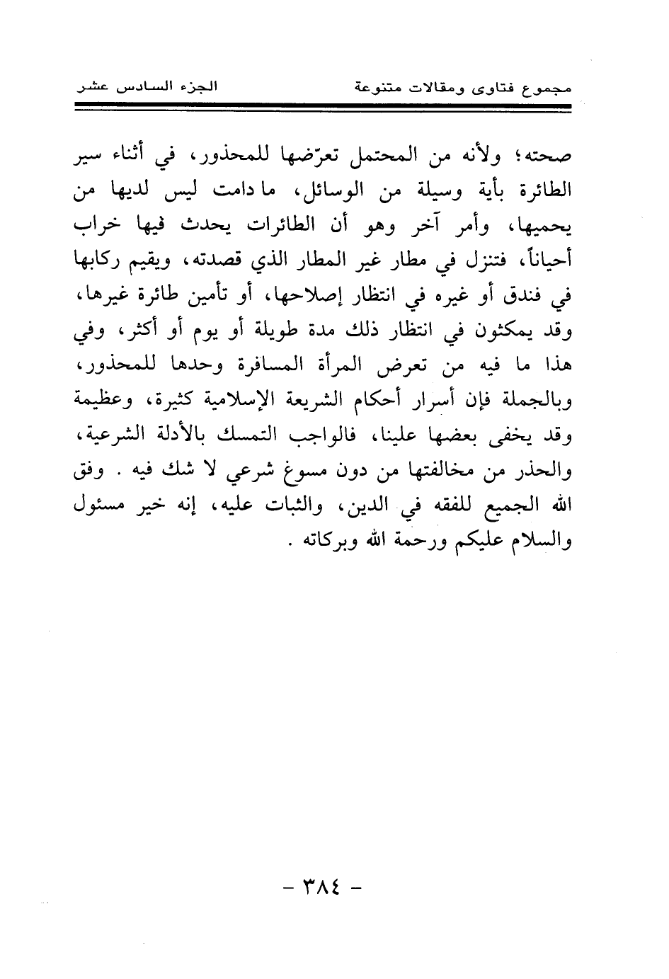 صحته؛ ولأنه من المحتمل تعرضها للمحذور، في أثناء سير الطائرة بأية وسيلة من الوسائل، ما دامت ليس لديها من يحميها، وأمر آخر وهو أن الطائرات يحدث فيها خراب أحيانا، فتنزل في مطار غير المطار الذي قصدته، ويقيم ركابها في فندق أو غيره في انتظار إصلاحها، أو تأمين طائرة غيرها، وقد يمكثون في انتظار ذلك مدة طويلة أو يوم أو أكثر، وفي هذا ما فيه من تعرض المرأة المسافرة وحدها للمحذور، وبالجملة فإن أسرار أحكام الشريعة الإسلامية كثيرة، وعظيمة وقد يخفى بعضها علينا، فالواجب التمسك بالأدلة الشرعية، والحذر من مخالفتها من دون مسوغ شرعي لا شك فيه. وفق الله الجميع للفقه في الدين، والثبات عليه، إنه خير مسئول والسلام عليكم ورحمة الله وبركاته.