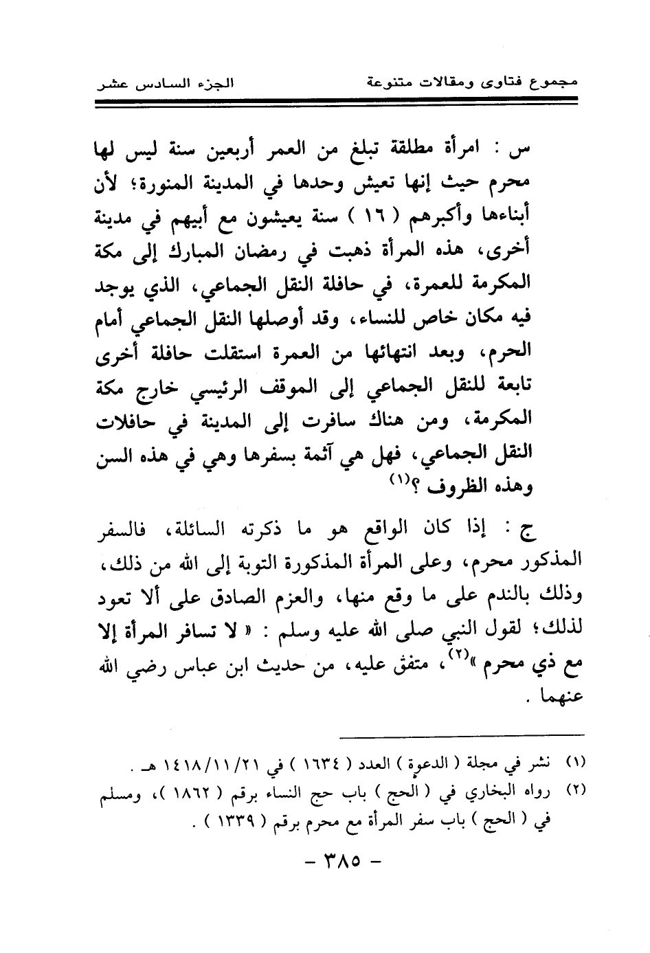 س: امرأة مطلقة تبلغ من العمر أربعين سنة ليس لها محرم حيث إنها تعيش وحدها في المدينة المنورة؛ لأن أبناءها وأكبرهم (16) سنة يعيشون مع أبيهم في مدينة أخرى، هذه المرأة ذهبت في رمضان المبارك إلى مكة المكرمة للعمرة، في حافلة النقل الجماعي، الذي يوجد فيه مكان خاص للنساء، وقد أوصلها النقل الجماعي أمام الحرم، وبعد انتهائها من العمرة استقلت حافلة أخرى تابعة للنقل الجماعي إلى الموقف الرئيسي خارج مكة المكرمة، ومن هناك سافرت إلى المدينة في حافلات النقل الجماعي، فهل هي آثمة بسفرها وهي في هذه السن وهذه الظروف؟ (¬1) .