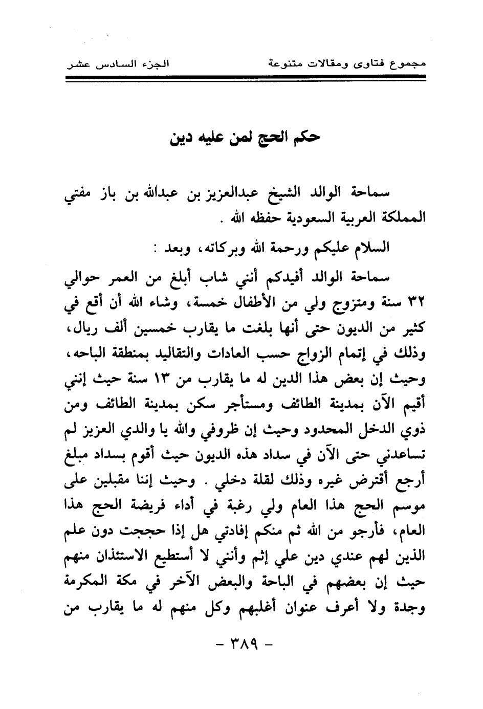 سماحة الوالد أفيدكم أنني شاب أبلغ من العمر حوالي 32 سنة ومتزوج ولي من الأطفال خمسة، وشاء الله أن أقع في كثير من الديون حتى أنها بلغت ما يقارب خمسين ألف ريال، وذلك في إتمام الزواج حسب العادات والتقاليد بمنطقة الباحة، وحيث إن بعض هذا الدين له ما يقارب من 13 سنة حيث إنني أقيم الآن بمدينة الطائف ومستأجر سكن بمدينة الطائف ومن ذوي الدخل المحدود وحيث إن ظروفي والله يا والدي العزيز لم تساعدني حتى الآن في سداد هذه الديون حيث أقوم بسداد مبلغ أرجع أقترض غيره وذلك لقلة دخلي. وحيث إننا مقبلين على موسم الحج هذا العام ولي رغبة في أداء فريضة الحج هذا العام، فأرجو من الله ثم منكم إفادتي هل إذا حججت دون علم الذين لهم عندي دين علي إثم وأنني لا أستطيع الاستئذان منهم حيث إن بعضهم في الباحة والبعض الآخر في مكة المكرمة وجدة ولا أعرف عنوان أغلبهم وكل منهم له ما يقارب من